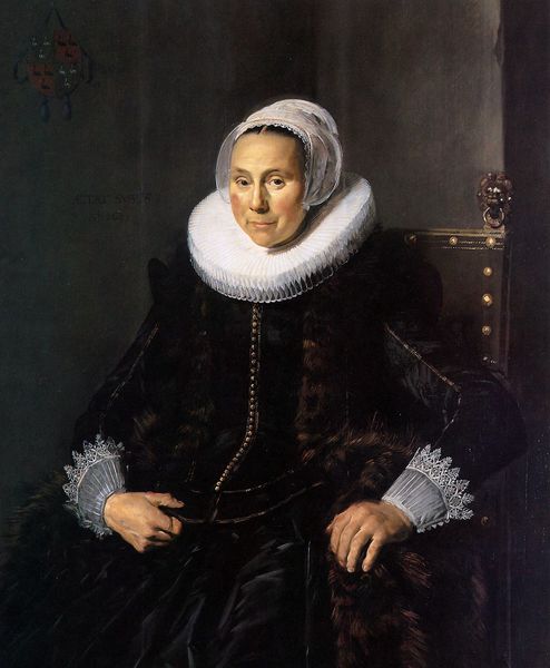 Editor: Here we have Frans Hals's "Portrait of a Woman with a Fan," created around 1640. It's an oil painting, and what strikes me immediately is her somewhat austere expression. It feels very…Dutch! What can you tell me about this portrait? Curator: It's fascinating how Hals captures a sense of the individual while also embedding them within a very specific societal framework. This painting comes from the Dutch Golden Age, a period of immense economic prosperity and civic pride. Portraits weren't just about likeness, but about projecting status and virtue. Notice the restrained palette, the woman's elaborate but modest attire... How do you think this reflects the values of the time? Editor: Well, the lace collar and cuffs do seem to indicate wealth, but the overall feeling isn't flamboyant. Maybe a sort of reserved prosperity? What's the significance of her holding the fan and chain? Curator: Exactly. And think about who commissioned these portraits. This was a rising merchant class, keen to display their success but wary of appearing too ostentatious. The fan and the gold chain she is holding were likely precious personal items, but their quiet display tells a story of personal identity shaped by the public eye, of wealth worn with a sense of responsibility. Can you see how Hals uses brushwork to subtly animate the scene, almost as if the woman is present and captured in time? Editor: I do see that now – it's not a static image at all. It feels much more…alive than I initially perceived. It really is a window into that world. I learned how this portrait tells us so much about Dutch society at that time. Thank you! Curator: Indeed. The painting is as much a portrait of a woman as it is of a specific historical moment, reflecting and shaping social and cultural values, and leaving a trace in time.