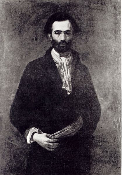 Editor: Here we have Ivan Kramskoy's "Portrait of the Artist Ilya Repin." The tonality is quite muted, all browns and greens, but it creates a captivating, somber mood. What stands out to you? Curator: Notice first how Kramskoy uses a restricted palette, limiting chromatic intensity to foreground form and subtly differentiating tone. Ask yourself: how does this serve the work's representational aims? Consider also the placement of Repin within the frame. Editor: It’s very direct, the gaze is intense, but the body is slightly turned, creating a dynamic tension, an engaging pose. It seems almost lifelike. How was this realism achieved from a formal perspective? Curator: Examine the brushwork closely. Note how Kramskoy modulates the paint application, creating impasto in the face to capture light, then using smoother, flatter strokes in the background. How does this differential handling of paint affect your reading of the painting's surface? The composition invites scrutiny of form and facture. Editor: The soft blending makes the face and the ruffled hair particularly lifelike! I noticed the chain that hangs down on his jacket. Is there significance to it, or to the precise tone of green in his coat? Curator: While iconography may be suggestive, focusing on the materiality of the piece itself: how the color choices interplay, how brushstrokes articulate form, grants the most fundamental access to meaning. Reflect upon the artist’s decision making from a purely structural standpoint. Editor: I see. It’s the relationship between form and technique that matters. Curator: Precisely. Looking closely at its pure elements offers insight beyond mere representational concerns, a chance to investigate form’s intrinsic value. Editor: Fascinating. I initially perceived the work as simply representational. But now I see it is also about texture, paint and composition. Thanks for pointing out how artistic elements interact to deepen the portrait’s meaning.