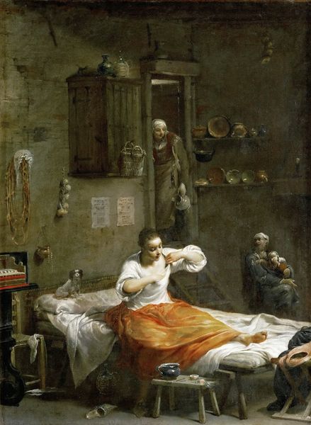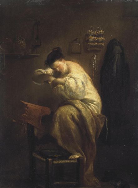 Curator: What a powerful image. Ferdinand Georg Waldmüller created this painting, titled "Erschöpfte Kraft" or "Exhausted Strength" in 1854, working in oil. The artist vividly portrays the quiet tragedy and relentless burdens placed on women, particularly mothers, during the period. What are your initial thoughts? Editor: Stark and heartbreaking. The heavy shadows, coupled with the pale light on the sleeping child, creates an incredibly moving, almost suffocating atmosphere. There's an immediate sense of stillness, broken only by an untold story of labor. Curator: Indeed. Waldmüller, rooted in both Romanticism and Realism, sought to depict the lives of ordinary people with honesty. In "Exhausted Strength", the narrative speaks volumes about the realities of motherhood amidst widespread poverty and limited opportunities for women in 19th-century Europe. Note the prone figure on the floor. Editor: It's an unflinching look at maternal exhaustion. Her posture, collapsed beside the cot of the sleeping infant, isn't just a portrait of weariness, but an illustration of the intense socioeconomic pressures women faced. It critiques the expectation that women are somehow inexhaustible. Curator: Precisely! Her 'strength' has indeed been exhausted, and it forces us to reflect on how society both idolized and simultaneously exploited the role of women as caretakers. This piece makes visible that invisible labor. Editor: Thinking about intersectionality, this work feels prescient in its commentary on gendered labor. Even now, there are lingering issues relating to caregiving disparities along gender and class lines, as well as a reluctance to acknowledge, compensate, or support these kinds of invisible, affective labors. Curator: The fact that the room is shrouded in shadow except for the child underscores that very dynamic; all is sacrificed for this young life. It pushes us to question the romanticized images that often concealed this truth from popular view. Editor: Absolutely. Waldmüller's "Exhausted Strength" delivers an unvarnished, deeply felt observation of women's material conditions. Curator: It resonates, still, after all these years, provoking difficult, necessary dialogues around gender, labor, and the realities of care. Editor: This is a sobering reminder to value the work and dignity of all caregivers.