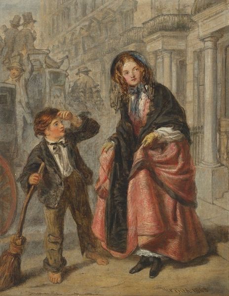 Curator: Augustus Edwin Mulready's painting titled "Our Good Natured Cousin" is a bustling genre scene rendered with oil paints. What strikes you first about it? Editor: Well, beyond the technical skill – look at those shadows! – it's the almost theatrical air. The figures feel consciously posed, like players on a very precisely designed stage. Curator: Yes, observe the attention to detail in the figures' clothing, their accessories. Note also how their class status contrasts against the surrounding environment: see the undertaker's business right next door? And discarded objects in the foreground, all quite purposefully rendered, giving an insight into urban society during Mulready's time. Editor: It’s a fascinating jumble. I find my eyes flitting between the central group with their pretty pink parasols and that slightly grim undertaker's shop. There's this vibrant life happening right next to the ever-present spectre of death. Am I being overly dramatic? Curator: Not at all. Mulready was depicting the vibrant and complex fabric of daily urban life, touching on both its delights and its harsh realities. The production of paintings such as these helped establish what art historians know now as a kind of "high art realism", with artists working with various mediums in order to establish new codes of perception, realism that could represent life for more than just wealthy patrons. Editor: The details really speak to that. Look at the little girl by the pillar with her flowers, clearly not part of the leisured class on display. There’s a whole untold story there, of labor and disparity coexisting on the same street corner. It’s beautifully painted but carries this quiet commentary, like a wry smile. I enjoy these group-portraits, a whole narrative unfolds. Curator: Indeed. So Mulready provides an important piece of social commentary by depicting London during an era undergoing immense social change. His craftsmanship adds significant visual information to ongoing debates and discourse around modern urbanism, economics, labor and society at large. Editor: Precisely. Looking closely, one can trace how class consciousness infuses all artistic practices and informs this oil painting style in its particular period and locale. There's more to unravel still in this fascinating slice of Victorian life. Curator: It is quite amazing to imagine how an object like this one can unlock and unpack histories that might remain otherwise untouched.
