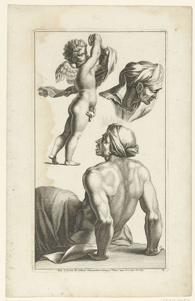 Editor: Here we have "The Three Graces," an etching by Pieter Tanjé. The figures have this really fascinating quality, almost like a study rather than a completed piece. How should we understand this particular iteration? Curator: Think about the materiality first. It’s a print –an etching– so its value initially resided in its reproducibility. It wasn't about unique artistic genius but about circulating a specific ideal, readily available to a burgeoning art market. Editor: So the medium itself democratizes the image, to some extent? Curator: Precisely! Consider the cost of production versus, say, an oil painting. Who had access? These images, multiplied through printmaking, shaped taste and transmitted ideologies far and wide. And the material of paper itself suggests a different type of consumption than, say, a large-scale sculpture intended for a wealthy patron's villa. This one is for study, not spectacle, and so we must reflect upon the economic status of those able to afford educational tools, like printed images. Editor: That's fascinating. It almost reframes how we look at even classical subjects like the Graces. The focus is not as much on an idealized view as the commercialization of classic ideals. Curator: Indeed. Furthermore, the red chalk echoes the materiality, as red chalk drawings and prints of this colour were popular methods for students to learn figure drawing, mimicking ancient statues that also would have this monochromatic colour, which aids with the study of anatomy and form. Editor: It gives you a lot to think about. I hadn't really considered the role of prints in spreading certain images to specific markets. Curator: It’s about decentering the singular artwork and acknowledging its role within broader economic and social systems of its time. The power is in how it circulates.