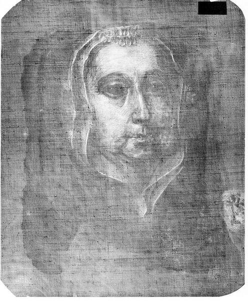 Editor: This is an X-radiograph of "Dona Velata," by an anonymous artist, held at the Harvard Art Museums. It's quite ghostly. What symbols do you see here? Curator: The veil is primary; a sign of modesty, mystery, and transition. Consider how veiling has signified sacredness, mourning, or even a woman's marital status across cultures. What emotional resonance does it hold for you? Editor: I see a hidden story, something just out of reach. Thanks, this gives me a lot to consider! Curator: Indeed. The very act of X-raying reveals a hidden dimension, inviting us to contemplate what lies beneath surfaces, both literal and symbolic.