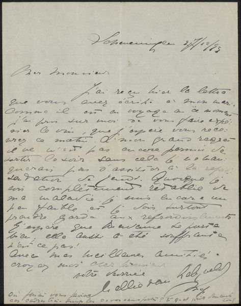 Editor: This piece is titled "Brief aan Philip Zilcken," possibly from 1897-1898 by Jules Herpain, made with ink on paper. The delicate script gives the work an air of intimacy and it is a glimpse into a bygone era of letter writing. What draws your attention in this handwritten letter? Curator: What immediately strikes me is the careful structuring of the composition. The text isn't simply placed haphazardly; notice how the lines are spaced and how Herpain uses the upper portion of the paper for the address and salutation, setting the tone before descending into the body. We see this careful application of controlled media (ink) and paper. Editor: So, you see it as more than just a letter; it's a consciously crafted object? Curator: Precisely. Observe the controlled strokes of the pen, creating a rhythm and balance. Even the slight variations in line weight and the flourishes within the calligraphy contribute to its aesthetic quality. We should consider how form and meaning interplay. Can the material object and its artistry elevate the text's intent and function? Editor: That makes me see the letter in a completely new way. It's like the form is just as important as the message. Thanks for clarifying, I didn't see it that way at first glance. Curator: The material choices enhance its beauty and expressiveness and it certainly shows Herpain's intention. I learned much from the piece myself.