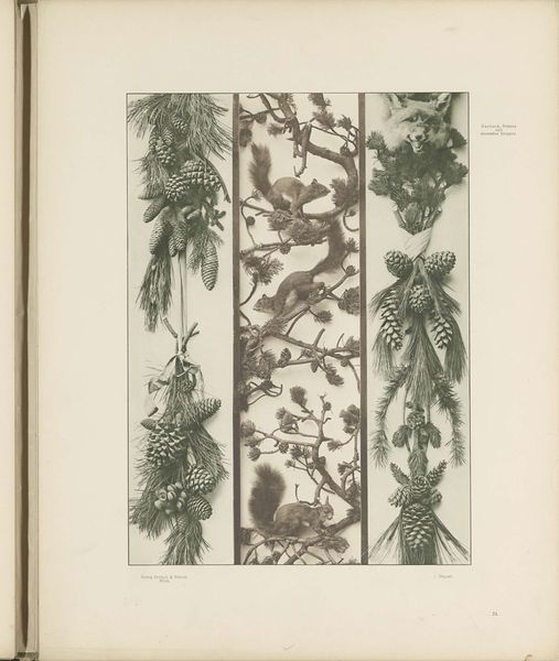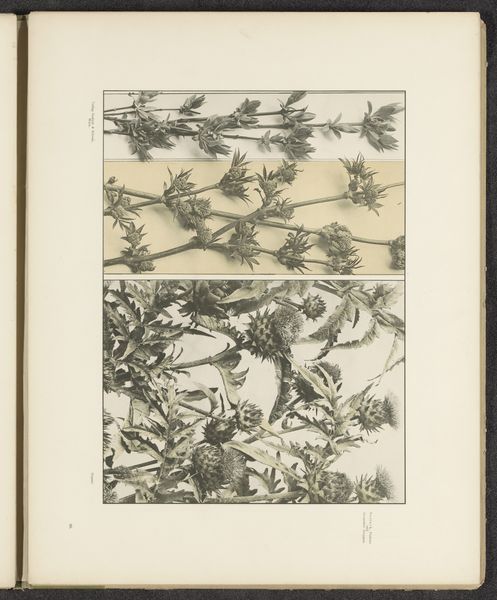 This print, "Twee vlakken met Japanse esdoorn en scheuten van pioenrozen" presents two distinct botanical studies, organized into separate rectangular frames. The anonymous artist's choice of monochrome emphasizes texture and form. The upper panel depicts a dense network of Japanese maple leaves, their serrated edges creating a dynamic, almost frenetic pattern that fills the space. In contrast, the lower panel displays a more orderly arrangement of peony shoots. The verticality of the stems and the soft, rounded shapes of the budding leaves provide a counterpoint to the jagged lines above. The division of the print into two distinct registers invites us to consider the structural relationship between these forms. It is an exercise in contrasting natural elements, an exploration of botanical forms, and an invitation to consider how we organize and categorize the natural world. The artist invites us to observe and decode nature’s inherent structures.