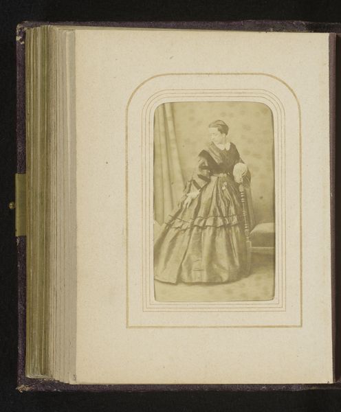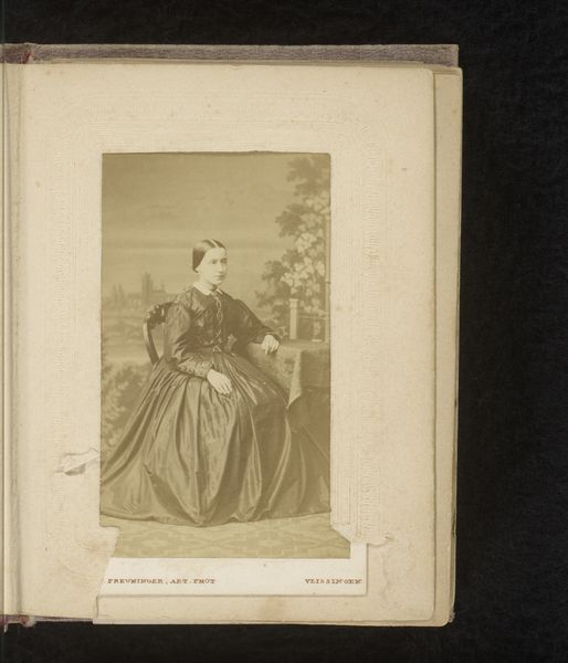 Curator: This gelatin-silver print, titled "Portret van een vrouw, zittend aan een tafel", comes to us from between 1860 and 1890 and carries the signature of J. Horsburgh. Editor: There's an unmistakable air of Victorian domesticity here, wouldn't you say? Almost suffocatingly so, at first glance. Curator: Indeed. You're immediately struck by the density, not just in the physical presentation within that heavy album page, but in the dress itself. All those stripes...the yards of fabric required...It speaks volumes about middle-class respectability. The materials here tell us about social status, really, and the sitter's likely relationship to manufacture and trade, not just the trappings of leisure. Editor: Absolutely, but also I feel a peculiar disconnect between that outward projection of bourgeois life, that enforced passivity of pose...and perhaps something more. I keep coming back to the expression in her eyes; there’s a hint of weariness or pensiveness there that subverts the conventional reading of the photograph. It has a story beneath the surface. Do you sense that? Curator: That’s a really astute observation. It highlights how photographic portraiture of the time—the technologies, the chemistry—mediated between the self and its representation. The material reality of how this image was created affects our perception, too, it speaks to what gets obscured, almost by design. Editor: Exactly. The artistry isn’t just in capturing a likeness but in framing, concealing, perhaps unintentionally revealing other truths. Thinking about Horsburgh, what’s really on his mind? I wonder, as well, about the craft involved: the darkroom practices of the period and how this image, through both technical ability and time has been able to endure? What might it convey to viewers back then versus viewers like us now? Curator: That brings us full circle, really, to the tangible nature of the photographic object and its ongoing conversation with audiences across time. It invites speculation and imaginative engagement to complete its layered narrative, doesn't it? Editor: I find it so compelling, reflecting not only on what she saw, but on what we see. The very notion of sitting there in striped finery brings forth so much that this woman can make us think and dream.
