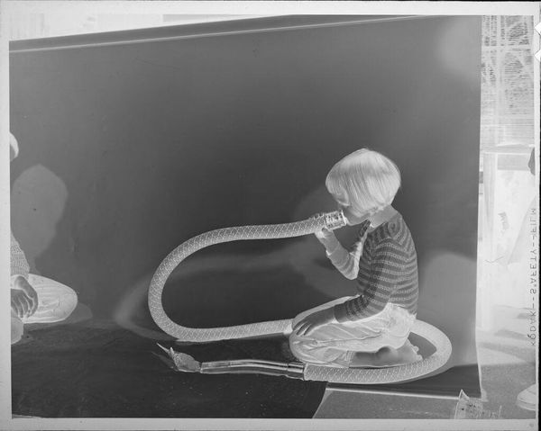 Editor: This photograph, "Untitled (dog, bird, and child)" by Lucian and Mary Brown, shows a child, a dog, and a bird, and strikes me as an intimate moment captured. What symbols do you see at play here? Curator: The grouping of a child, dog, and bird often signifies innocence, freedom, and companionship. The dog is loyalty, a guardian. The bird, a messenger. Editor: A messenger of what, do you think? Curator: Perhaps the potential for a harmonious connection between humanity and nature. Note how the child interacts gently. The inverted tones make me think of memory and lost things. Editor: So, in a way, it's a commentary on our relationship with animals and nature. I see it now, the intimacy and the potential for understanding between species. Curator: Precisely. This image encapsulates the essence of interspecies communication.