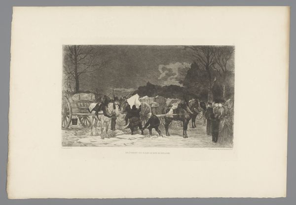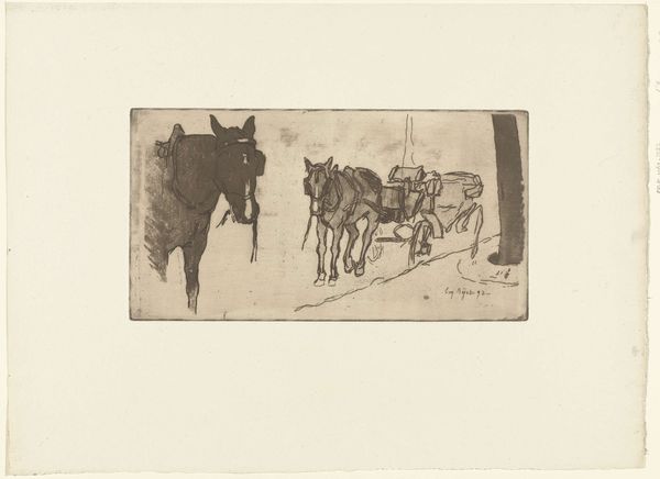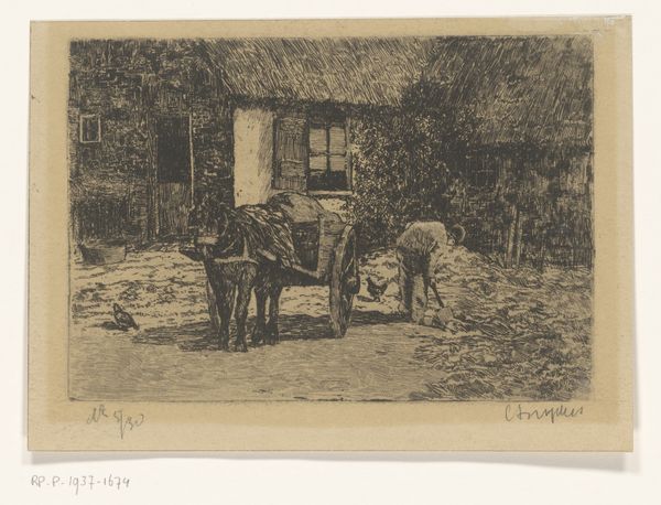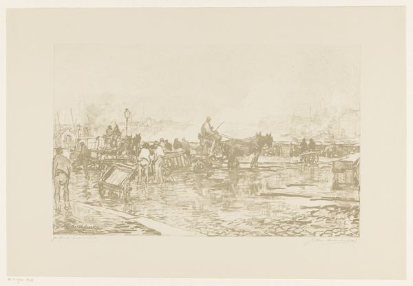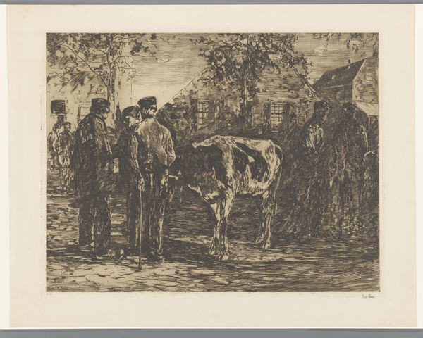Willem de Zwart made this print, Koemarkt, using etching. Looking at this piece, I’m struck by the way the world is rendered through a network of lines. See how the figures and animals emerge from this sea of marks? It's like the artist is thinking out loud. The physical surface is crucial here. The etched lines create a velvety texture, a kind of visual hum that activates the surface, giving it a tactile quality. Focus on the cows themselves: the density of marks defining their forms, the way the light catches certain areas, suggesting volume and weight. It’s not just a picture of cows, it’s an investigation of how we perceive and represent them. You might see echoes of Rembrandt’s etchings here, or even some of Daumier’s lithographs in the work's social realism. Ultimately, it is less important to identify a definitive influence than to recognize the continuous exchange of ideas that exists within art. This piece is an invitation to embrace the richness of ambiguity and accept the multiple interpretations that arise from it.