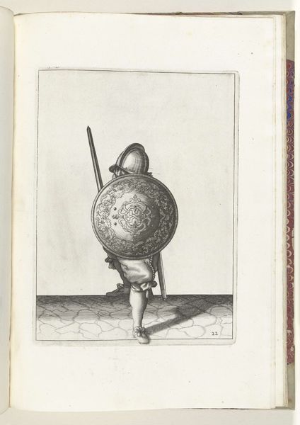 Curator: What strikes you first about this rather unassuming engraving? Editor: There's a vulnerability, I think. He’s armored, but posed almost submissively. He seems exposed rather than protected, challenging conventional masculinity. Curator: That’s a striking reading. This is “De exercitie met de targe en rapier” from around 1616-1618, made with pen and engraving by Adam van Breen. The title translates from the Dutch to "The exercise with the targe and rapier: how the soldier must defend himself with the targe resting against the left knee and left shoulder, the drawn rapier in hand, seen from the front.” It's part of a series on military exercises. Editor: So, it's literally a how-to guide! The symbols, therefore, become even more loaded. A shield traditionally speaks of defense, security—yet its position makes me consider not only his physical safety, but his social or psychological vulnerability. It really does convey a specific moment in the historical development of conflict as performance. Curator: That's fascinating – this posture wasn't meant to convey passivity at all. Think of what the image itself might symbolize to the intended audience. It’s an instructional plate – meant to show proper defense with the shield, or targe. The military was evolving, changing how battles were fought. This isn’t necessarily about individual strength; it's about the technique, about shared practice. Van Breen is reminding us that military skill comes from collective action. Editor: It becomes almost a choreographic notation then! This is such a telling, poignant glimpse of social evolution playing out, sword in hand. Thank you for making the symbols feel more meaningful and connected to something much deeper than defense, in my reading of the picture. Curator: It reminds us that even the tools of war are steeped in layers of intent and purpose. Editor: Indeed; seeing that reflected in art helps reveal so much about us, both then and now.