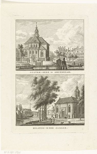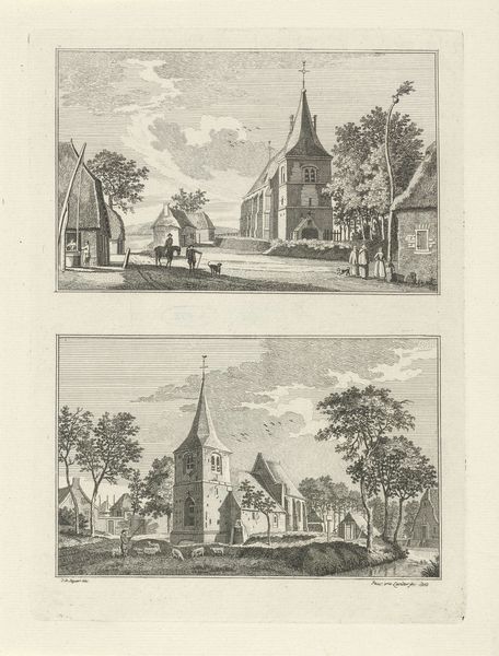Carel Frederik Bendorp created this print, "Twee dorpsgezichten te Bolsward: Broerekerk en kapel van het mirakelbeeld," using etching techniques. The work divides our attention between two distinct village scenes, each rendered with careful precision. Notice how the composition uses a play of light and shadow to define the architectural forms of the buildings, creating depth and volume. The texture, achieved through fine lines, captures the material quality of the stone and brick. The upper scene shows the Broerekerk with figures that animate the space around the structure. Bendorp's work reflects broader philosophical ideas about representation and space. The print invites us to consider how architectural forms structure social life, a concept that aligns with structuralist thought. In both scenes, perspective is manipulated to create a sense of depth within a confined space, demonstrating how visual techniques can alter our perception. Consider the interplay between the detailed architectural renderings and the more freely rendered skies. This contrast emphasizes the constructed nature of the built environment against the natural world. The print serves as a site for exploring the dialogue between art, architecture, and society, inviting ongoing interpretation.