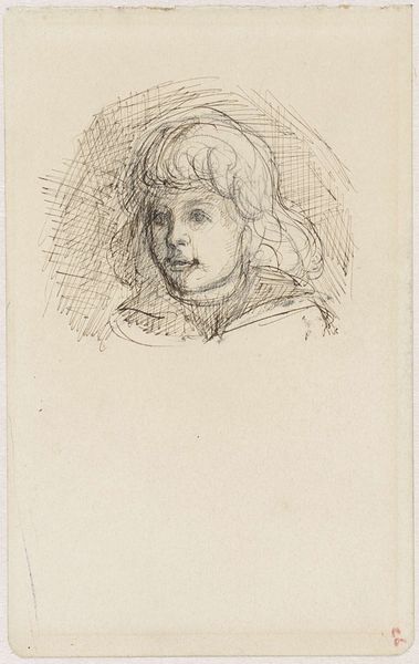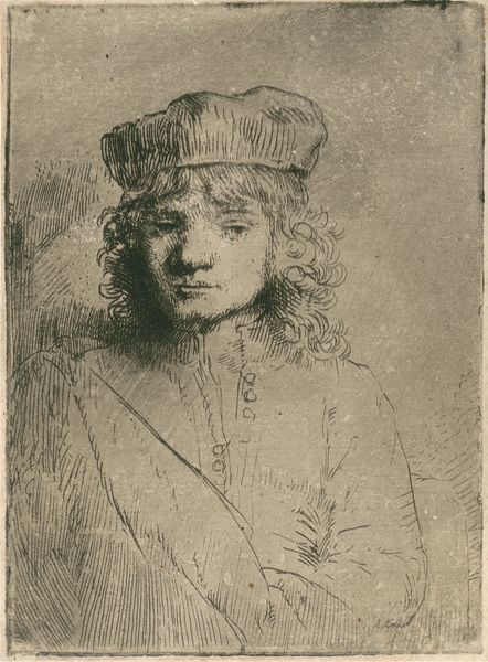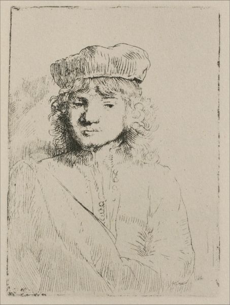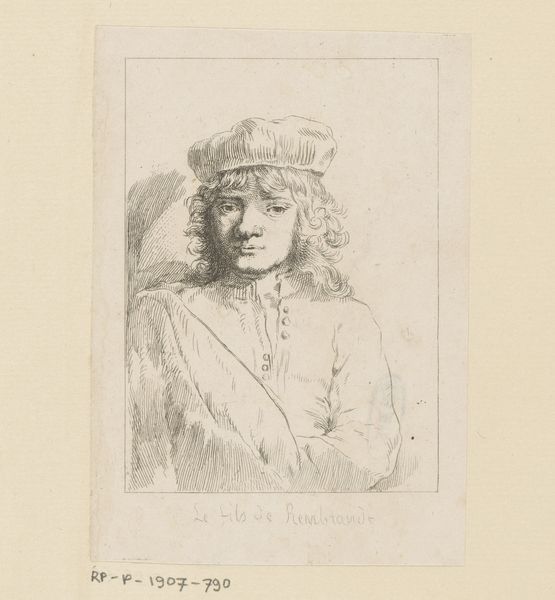 Editor: Here we have an etching from 1819, "The Artist's Son, Titus" by Ignace-Joseph de Claussin, now housed in the Rijksmuseum. I'm really struck by how intimate this feels, despite the lines being so precise. The subject's gaze is really direct. What stands out to you the most when you look at it? Curator: Well, aren’t etchings magical portals? For me, it’s the *dance* of light and shadow that pulls me in – Claussin's masterful manipulation of line to create depth. You sense a deep, personal connection, almost as if the artist were trying to capture not just Titus’ likeness, but also his very *essence*, right? Editor: Absolutely, his expression does feel very lifelike. Do you think this captures an important moment? Curator: Perhaps! You have to consider that this was done posthumously. Rembrandt, the original artist, created several paintings and drawings of his son Titus. I like to think that Claussin has translated those intense moments to something so beautiful through engraving. He’s like a medium channeling a spirit! Now, look closer… notice the angle, the curls…Does this echo other works from the Dutch Golden Age? Editor: I see what you mean, there's a very intimate feel to the piece reminiscent of many golden age paintings. Almost as if Titus is staring straight through you... Curator: It's the gaze. Those artists just KNEW something, didn’t they? Editor: Definitely! Thank you, it's fascinating to learn about it this way. Curator: The pleasure was all mine! Now you get it—art's about feeling first.