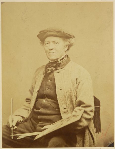 Pieter Siewers created this subdued, sepia-toned portrait of an unknown young man, likely in the mid-19th century. The composition is neatly divided, the subject positioned just off-center, balancing formality with a hint of informality. The young man's attire—a patterned waistcoat, jacket, and loosely tied bow tie—lends a sense of middle-class aspiration, subtly undermined by the casual drape of the pipe and his relaxed posture in the ornate chair. Siewers plays with textures, contrasting the smoothness of the table against the woven fabrics, enriching the visual field. This photograph offers a glimpse into the era's social codes and representational strategies. It invites us to consider the role of portraiture in constructing identity, where each element functions as a sign, reflecting broader cultural values about class, respectability, and individual expression. The muted palette and careful arrangement encourage a continuous re-evaluation of how meaning is constructed through visual representation.