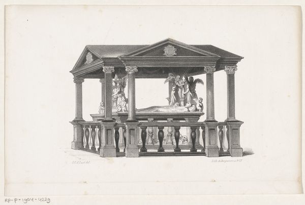 Curator: Here we have "Gezicht op een colonnade in de tuinen van Slot Sanssouci", or "View of a Colonnade in the Gardens of Sanssouci Palace". Created sometime between 1747 and 1774, it is currently held in the Rijksmuseum collection. Editor: It’s immediately striking, isn’t it? So structured, precise, yet it has this dreamy, almost theatrical quality, like a stage set waiting for the actors to appear. I feel like I am in a play or a Baroque music video. Curator: Exactly. This work is an engraving, meaning the image is incised into a metal plate. The process, labor-intensive and highly skilled, allowed for the mass production of images, thus shaping the consumption of architectural imagery and ideals. It offered the aspirational class of the time a way to fantasize about palaces and nobility they might never visit. Editor: The act of engraving itself reminds me of slow living. No generative AI, just time and skill. But looking closer, it's interesting how this supposedly objective rendering of architecture evokes such an artificial scene; almost everything, the perfect symmetry, and the stylized figures, feels idealized. Curator: The choice of medium highlights the interplay between art, labor, and consumption. Each print from the engraved plate allowed the Baroque aesthetic, which valorized ornamentation, lavish displays, and powerful architecture, to reach a far wider audience than would otherwise be able to admire this architecture. Editor: I am interested by how this engraving technique shapes my experience, everything rendered so sharply that I can sense the material realities but struggle to suspend my disbelief in the fictional reality. I begin wondering about those who consumed the imagery... did the fantasy of access amplify or quell any actual longing to inhabit this architectural world? Curator: Good questions, but difficult to prove using this primary source alone. This print provides insight into 18th-century production and dissemination. And reminds us how social desires were intricately intertwined with emerging commercial print networks. Editor: Ultimately, this seemingly simple landscape speaks volumes about longing, representation, and access to culture, or maybe I’m just projecting again, hmm. Curator: No, I believe it raises important connections worth contemplating.