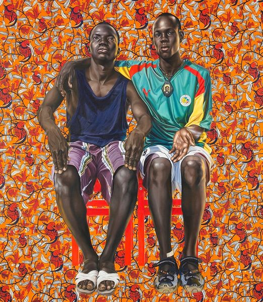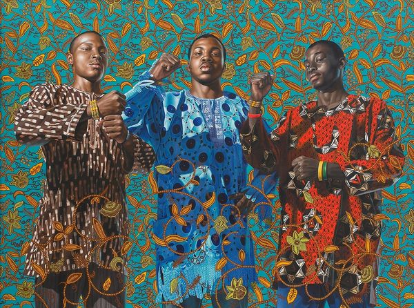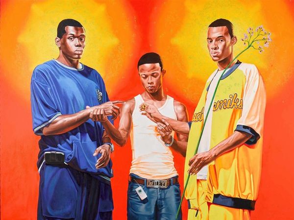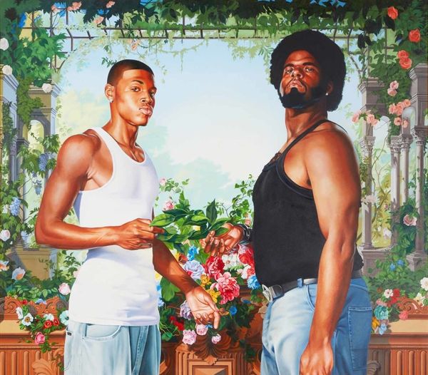 Kehinde Wiley painted Passing; Posing Annunciation at some point in his career, using a realistic approach to the figures, set against a decorative background. It's like he’s saying, let’s make something new out of something old. The background, a flat plane of red, is taken over by these curling green vines. Then he’s got these two cool figures in the foreground, all done in a really tight, realist style. Look at the brushwork - it’s so smooth, it’s almost like you can’t see it. He’s not hiding anything, but he’s also not letting you see how he did it. It is really skilled, but in a way that doesn’t shout, more like a whisper. It reminds me of Chris Ofili, who also takes on historical painting but brings something totally fresh. Ultimately, art isn’t about answers, right? It’s about asking questions, keeping the conversation going.
