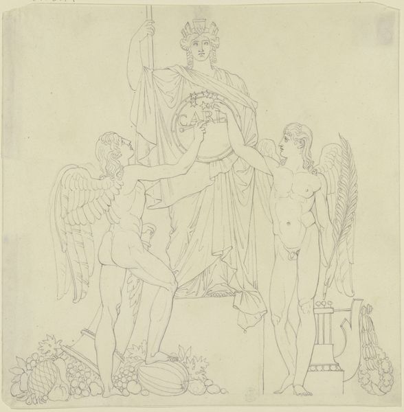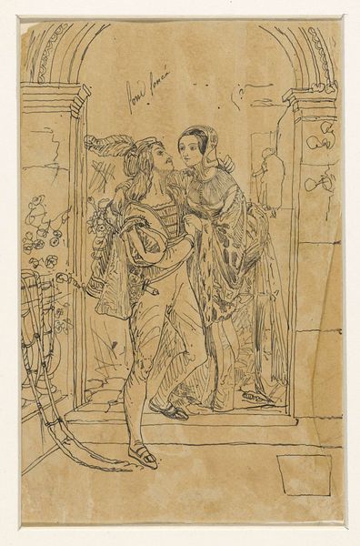 Nicolai Abildgaard created this drawing, "Pamphilus og Davus i samtale," using pen and brown ink on paper. The composition is stark, dominated by the figures of Pamphilus and Davus, sketched with precise lines against the plain backdrop. Notice how Abildgaard uses line to define form and convey emotion. Pamphilus stands with an open gesture, while Davus points emphatically, their interaction captured in a dynamic, almost theatrical manner. The use of space is intriguing; the figures are presented in a shallow depth, pushing them to the forefront and emphasizing their presence. The simplicity of the medium focuses attention on the formal elements of line and form. This aesthetic choice invites contemplation of the underlying structure of human interaction and the classical themes explored in Abildgaard's work. The artwork's semiotic richness lies in its classical references and the visual dialogue it establishes, prompting us to reflect on the nature of communication and representation.