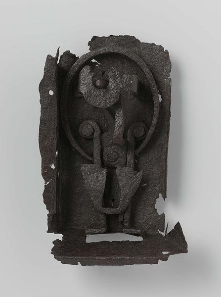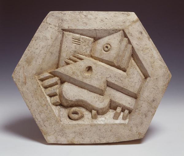 Curator: Here we have Jacques Lipchitz's "Study for a Garden Statue," currently housed in the Tate. Editor: It has a primitive, almost totemic quality. It reminds me of something ancient dug up from the earth. Curator: Yes, its verticality and repeated geometric forms do echo ancient structures. The diamond shapes could be read as stylized eyes, or perhaps even symbolic portals. Editor: The figure at the top looks like a huddled, almost embryonic form. There is something vulnerable about it despite the solid base. Curator: The contrast speaks to the duality of human existence – the strength of our foundations versus the fragility of the self. It is a compelling meditation on growth and permanence. Editor: It's strange, this little sculpture evokes such a feeling of timelessness and mystery. I'm going to keep turning that over in my mind.