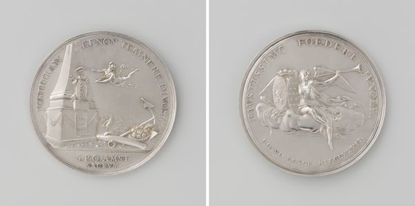 Curator: This piece is a 1674 engraving, "Sluiten van de vrede met Engeland en inname van Naarden door Willem III" by Christoffel Adolphi, struck in bronze. Editor: It has a rather somber, ceremonial feel to it. The cool tones and classical composition give it an air of austere importance, almost like a historical document pressed into a coin. Curator: Indeed, this is a medal commemorating the peace with England and the capture of Naarden by William III. These types of commemorative objects were produced to circulate and reinforce particular narratives amongst the populace. Bronze itself was carefully selected to show its resistance through the passage of time, a material carrier of Dutch history and resilience. Editor: Structurally, the obverse displays Willem III triumphantly on horseback. The controlled, curving lines, particularly in the horse's musculature, indicate baroque sensibilities. He's flanked by inscriptions. Tell me, do they amplify the message conveyed by the imagery? Curator: Absolutely. Note the deliberate crafting of the slogans and text—they emphasize William III as a bringer of both war and peace. Also note the depiction of the military units along the bottom of the obverse: They were very much reliant on material realities of production and labor. Bronze was a prized metal in this age, and the medal literally puts on display not only the Dutch material wealth but also technological prowess. Editor: On the reverse, we see a dove holding an olive branch over a placid seascape. This image echoes with earlier examples from antiquity; it is clearly referencing existing codes. Its semantic richness reinforces the desired meaning of 'peace' with pre-existing semiotic material. Curator: And it shows how statecraft under William of Orange was directly intertwined with economic realities. The Dutch Republic at this point relied on global networks of trade, resources extracted via colonial domination and mercantile acumen. A simple metal token carries within it an archive of complex political, social, and economic interactions. Editor: An elegant reduction of a turbulent time into a small, graspable, yet complex artistic statement. Curator: A reflection on both historical and artistic value encoded and shaped by power.