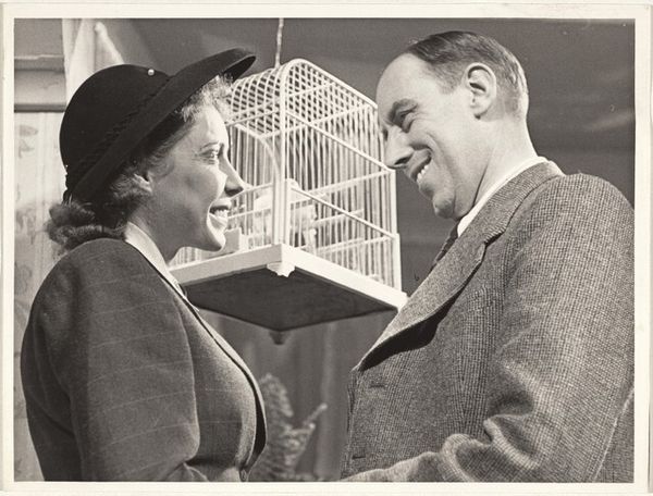 This gelatin silver print, "Actors before birdcage--Filming," was created by Robert Frank, most likely in the 1950s. Frank became known for his outsider’s perspective on American society. This image presents a behind-the-scenes look at the making of a film, a commentary on the constructed nature of reality. The actors, caught in profile, are separated by a birdcage that perhaps symbolizes the constraints of their roles, or the artificiality of the world they inhabit. Made in the USA, this photograph invites reflection on the performative aspects of everyday life. To understand this work more fully, we might look into the history of filmmaking in America, or the cultural symbolism of birds and cages. It’s through this kind of historical and cultural research that the full significance of Frank’s image begins to emerge.