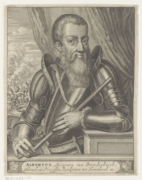 Curator: We're standing before Titian's "Portrait of Guidobaldo II della Rovere, Duke of Urbino," painted around 1545. Editor: Immediately striking! There's something quite somber in the coloration. Almost oppressive, despite the richness suggested by the armor. Curator: Guidobaldo was a significant figure. He inherited a duchy rife with political challenges, not least his family's relationship with the papacy. Editor: I wonder about the crafting of that armor. The oil paint mimics the cool, hard gleam of metal but can't quite replicate its weight and protective purpose. It’s a fascinating displacement. Curator: The portrait would have functioned to affirm his ducal power and his connections to a lineage of noble warriors. We see a calculated representation meant to bolster his image within a tumultuous political landscape. Think about his position after his father's assasination in 1538! Editor: What materials went into constructing that armor, how long would it have taken to create such an object? How much labor is concealed in these brushstrokes as it signifies power? The production process is key to understand this image beyond a simple representation of power. Curator: Certainly the armor signified power. But consider the Duke himself! Guidobaldo became a patron of the arts and sciences, fostering a cultural center in Urbino and a court celebrated for its intellectual discussions. The image attempts to capture more than sheer dominance. Editor: It all boils down to materiality. Even his 'patronage' depends on extracted value and surplus labor materialized into those works! How do we grapple with art without talking about where the raw materials, and the labor to shape those materials, come from? Curator: Absolutely crucial points. This image captures an interesting dialogue between social symbolism and lived realities. It allows us to dissect concepts of identity, labor and representation. Editor: Examining these paintings reveals material realities embedded in class relations. An ongoing process—we're excavating layers of history in every brushstroke!
