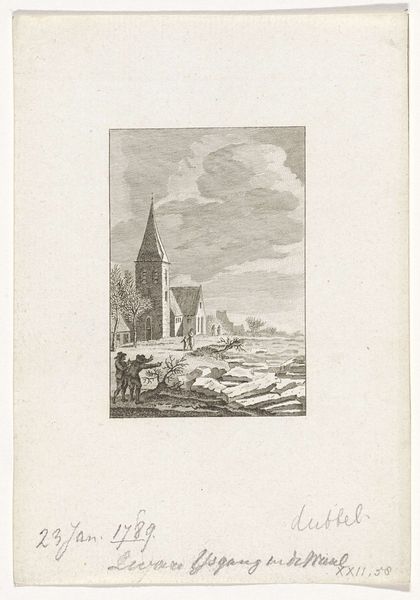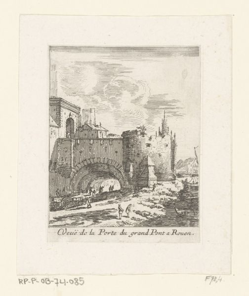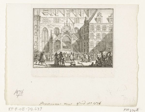 Curator: This is "Vertrek van de Staten Commissie van Rotterdam, 1786" by Reinier Vinkeles, made sometime between 1783 and 1795. It combines etching, engraving, and pen on paper. It’s quite a detailed cityscape, isn’t it? Editor: It is. My immediate sense is one of subdued ceremony. The palette is limited, which lends a formality to the departure scene, yet there’s a certain…ordinariness, if that makes sense. It feels less like high political drama and more like Tuesday morning. Curator: I see what you mean. Vinkeles was a master printmaker, and here he employs combined methods to produce quite a textured surface. Look at the variation in line work! Think of the labor and skill that go into translating an entire city onto this copperplate! Editor: Absolutely. The textures and lines evoke a very precise time in Rotterdam’s history, a city bustling with trade and power, though I can’t help but view the "departure" within the larger context of late 18th-century European politics, where revolution was in the air, challenging those old guard structures. Curator: Precisely! And observe how Vinkeles crafts perspective. We get this wonderful layered depth, almost theatrical—the boat pulling away, figures in the foreground, the architectural mass of the city rising behind. Editor: The composition almost creates a division of class—those in the boat being rowed away versus those on the shore. It begs the question: who is benefiting from this system? And at whose expense is this elaborate departure taking place? This piece invites that conversation about societal power structures of the day. Curator: A very astute observation. It's in collections with titles that involve "genre-painting." It’s the everyday and not-so-everyday labors and interactions that produce such moments. Think of the inks and papers being produced, transported, sold – all integral to creating and disseminating this image to wider audiences. Editor: It makes you think about access, too. How many people actually saw this print, and what did they make of it? What conversations did it start, or was it meant to reinforce the prevailing social and political norms? These artworks offer valuable opportunities to consider whose stories get told and how. Curator: Ultimately, it really exemplifies how Neoclassicism pulled from Baroque style; a confluence that really enhances the power in this engraving. Editor: Indeed, offering a snapshot not just of Rotterdam, but of a world on the cusp of transformative change, prompting me to reflect on the continuous ebb and flow of societal structures and who benefits and suffers.