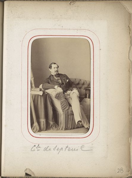 Curator: We’re standing before "Portret van baron De St. Marie," a photograph attributed to Moosbrugger, taken before 1864. It’s an albumen print, a common photographic process of the time. Editor: There's something melancholic about him. His pose—leaning against that plinth, hand nonchalantly in his pocket. It feels… staged, yet also somehow vulnerable. Curator: Albumen prints, like this one, were fascinating because they used egg whites to bind the photographic chemicals to the paper. Imagine the sheer scale of egg consumption needed for commercial studios! It makes you think about the hidden labor involved in creating these images. Editor: True. You almost forget about the labor given the refined outcome, the careful grooming, the precisely arranged pose, that little gleam from his watch chain. I'm stuck on how fleeting the pose is meant to seem, yet it's captured for eternity with great care, pinned into time using albumen and light. Curator: Exactly. And this points to a larger truth of studio photography. The elite sought it out precisely as an act of conspicuous consumption. For Baron De St. Marie, photography becomes another marker of wealth and status. And don’t forget the craftspersonship involved in setting up the shot: camera work and darkroom magic were developing quickly at the time. Editor: He is rather handsome, if I'm allowed to be frivolous for a moment! I find his expression intriguing; he appears deep in thought, perhaps slightly weary. Curator: And maybe we are wearied too—or perhaps refreshed—by the journey we have taken in exploring a mere snapshot. Thanks for that journey. Editor: Likewise. This makes me want to go back and really look at my own photo albums and give those photographs some proper respect and time.