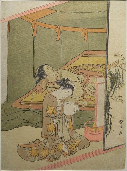 Editor: Here we have "Calendar: Selling Fans," a print by Suzuki Harunobu. The figures almost seem to float on the paper, and there’s a dreamlike quality to the scene. What catches your eye about this work? Curator: It feels like a fleeting moment, doesn't it? Harunobu has this incredible knack for capturing the ephemeral. Those young boys reaching, the woman’s gentle gaze… it's all so delicate. I wonder if it reminds you of a memory? Editor: It does! It makes me think of chasing after bubbles as a kid. Curator: Exactly! And those fans aren’t just fans; they’re calendars, markers of time passing. So, what at first seems like a simple street scene actually speaks to something much deeper, a gentle meditation on time and beauty. It’s quite poignant, isn’t it? Editor: Definitely, I hadn't thought of it that way. Thanks for sharing your thoughts.