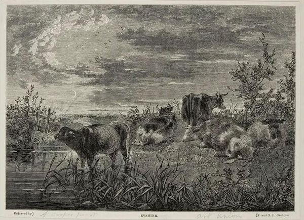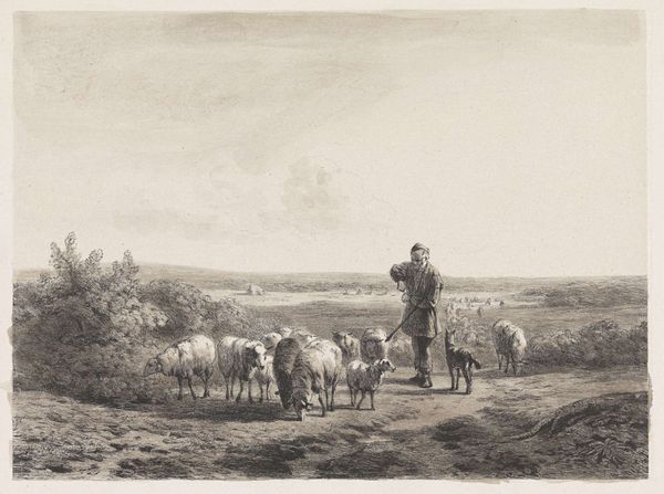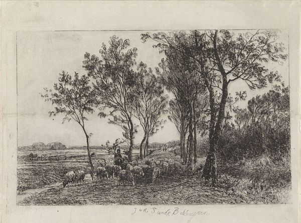 Curator: What a somber scene! This Charles Jacque print, made in 1867, immediately makes me think of bleak midwinter. The monochromatic tones create such a hushed atmosphere. Editor: Jacque's "Winter," yes. And immediately I am drawn to how this image, although depicting rural life, resonates so powerfully with themes of economic hardship in 19th-century France. You can read this landscape as a representation of resource scarcity and the struggle for survival. Curator: It's incredible how such delicate etching can evoke such hardship! See how the stark trees contrast with the figures tending to the animals. The trees symbolize resilience, but the grazing animals hint at how land provides both struggle and resources. Note also, the gathering of what seems to be firewood which further supports ideas of daily fight for survival. Editor: The symbolism here feels intentionally archetypal. Jacque is clearly pulling from familiar imagery—shepherds, flocks, barren trees—creating a narrative deeply ingrained in our cultural memory. The figure on the left resembles depictions of poverty throughout European art. Curator: Absolutely. Look at the lone figure, perhaps a woman, cloaked and almost faceless. This feels less a celebration of pastoral life and more a commentary on the anonymity and isolation of the working class. One sees no other people or buildings. Are they truly alone? What does the geography represent in this isolation? Editor: The use of sheep in this image adds a further layer to these readings. Sheep have historically served as symbols for human faith. The animals' quiet obedience makes it easy for viewers to connect their actions to religion and collective experiences of hard winter and quiet faith. The landscape becomes a stage for broader contemplation about the relationship of nature, mankind, and belief during challenging times. Curator: That adds nuance, doesn't it? I had focused on the somber conditions. I hadn’t explicitly tied them to the traditional connection between the figures with animals, rural life, and the search for something to trust or something trustworthy. But now that you mention it… it makes perfect sense. Editor: Well, looking at this scene from our perspectives now hopefully reveals both a historical snapshot of a certain time but also raises ongoing considerations about work, the struggle to continue on, and our relationship to landscape and spirituality. Curator: Yes, I think analyzing "Winter" from our distinct, but ultimately connected, perspectives gives the work both grounding in its context and timeless meaning for the present. It truly offers something to everyone.