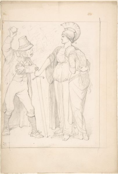 George Murgatroyd Woodward sketched "Country Lovers" with graphite on blue paper, capturing a dance of courtship and social commentary. Note the hat, a shared motif between the figures, yet distinct in its implications. The woman’s hat, paired with her basket of goods, speaks to her role and status, almost reminiscent of classical depictions of Ceres, goddess of agriculture. Her upward gaze is suggestive of aspiration or perhaps mere coquetry. The man’s hat is similar, yet there is a suggestion of foolishness in the way it sits on his head, in combination with his crooked smile and spindly frame. Such caricatures echo through history, resurfacing in medieval morality plays and Renaissance comedies, each time tweaked to reflect evolving societal norms. This isn't merely satire; it's a deep dive into the collective unconscious. The artist hints at underlying anxieties about class, gender, and the perennial human drama of courtship. This image triggers a recognition of familiar social types and the timeless dance of human interaction.
