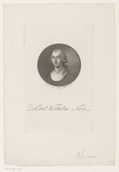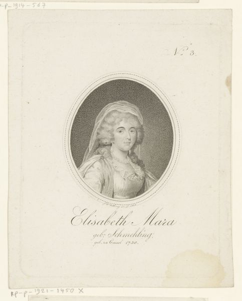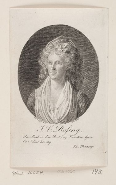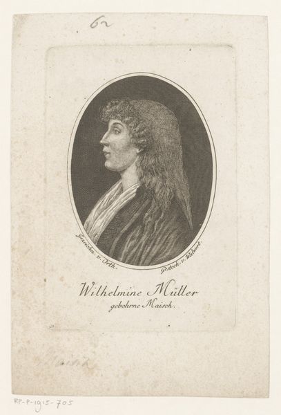 Curator: Up next, we have an engraving from Franz Xaver Gebhard: a portrait of Wilhelmine Augusta Müller, made sometime between 1775 and 1807. It's a delicate piece. Editor: "Delicate" is the word. She seems to float right off the paper. There's an airiness to her, a fragility almost, emphasized by the wispy tendrils of hair. Curator: I agree. Gebhard was working in the Neoclassical style, which favored line and form over color. Notice the precision in the engraving, particularly the subtle gradations creating volume in her face. It adheres to academic art traditions but, unlike other work in this vein, it's absent of stark and dramatic effect, and feels so personal. Editor: The oval framing focuses us, isolates her from any external context. And the eyes...they really draw you in, don’t they? A gaze both knowing and a little melancholy, like she’s seen things but chooses not to reveal all. This is typical of formal portraiture. Curator: Right. Though the lines of her garment are simple, classic, yet somehow the rendering remains natural, like it would hang and drape just so. Her dress suggests perhaps the sitter enjoyed some amount of wealth but was very modern in her taste. I feel as though I am getting a true read on her interior life, some private glimpse from all these centuries later. Editor: It's amazing how much personality an artist could imbue into a work, using only line and tone. And it also speaks to the power of portraiture itself, the attempt to capture a likeness but also an essence, the "who" of a person. The choice of engraving emphasizes the ephemeral nature of existence itself, how memories fade and are rewritten. It almost has the quality of a faded memory, doesn't it? Curator: Very true. It's as much about what's present as what feels lost. The artwork is a very nice moment captured within an in-between period of printmaking history that provides for a lot of consideration. Editor: I like how our experience of seeing it can open to the viewer such depths. Well, that certainly gives us something to contemplate, doesn't it?
