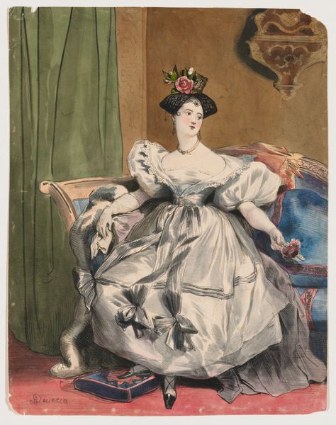 Alfred Edward Chalon produced this watercolor of a woman in evening dress asleep in an armchair sometime in the 19th century. The image presents a window into the social rituals and constraints placed upon women of the British upper class during this period. The woman's elaborate attire, complete with jewelry and flowers, speaks to the rigid expectations surrounding female appearance and presentation. Her slumber in an armchair suggests exhaustion, perhaps from the demanding social calendar and performance of femininity expected of her. The mirror in the background is an explicit reference to those expectations. Chalon was a portraitist to the Royal family, making this a record of a very particular social class. As such, we may need to examine etiquette manuals, fashion plates, and other period documents to decode the full meaning of this image. It is in this social context that the artwork gains its richest meaning.