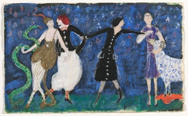 André Derain made "Figures from a Carnival" with watercolor in a private collection. You know, what grabs me about this piece is how Derain's letting the watercolor just *be* watercolor. No fussing, just laying down these juicy, transparent washes of color. It's all about the process, the immediate gesture. Check out the way he’s daubed in the red for the dress on the left – see how the brushstrokes are almost frantic, full of energy? The way the colors bleed into each other, the paper showing through—it’s like he’s chasing after the feeling of the carnival, not trying to perfectly capture it. And those black outlines? They’re so loose and playful, like he’s daring the painting to fall apart. It reminds me of the way Matisse would just slash at a canvas with color, embracing the mess and the immediacy of the moment. It’s all about capturing the fleeting joy of life, rather than getting bogged down in the details.