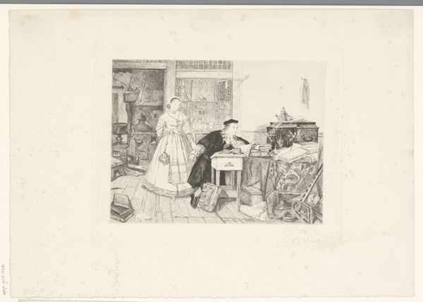 Curator: This print, created between 1862 and 1908, is titled "Interior with Young Woman Standing Beside an Alchemist at his Desk" and is attributed to Piet Verhaert. It’s rendered in an engraving style reminiscent of academic art. Editor: Ah, an alchemist interrupted! The light feels like it’s struggling to break through, just like the poor woman is struggling to get his attention. It has that heavy, serious air of secrets being kept behind dusty books. Curator: Indeed, the material rendering itself – the engraved lines – contribute to that weightiness. Consider the means of production; engraving involves a skilled artisan meticulously etching lines onto a metal plate. Each line, each shadow is consciously labored over. This speaks to the dedicated labor that crafts images for wider consumption. Editor: You’re so right, knowing the work that went into it does change my impression! Still, though, even if she’s interrupting the making of, well, anything – is it supposed to be so sad? Like a moth caught in amber. Is the ‘high art’ alchemy set against ‘low art’ housekeeping here? Curator: It’s certainly fair to say Verhaert might be exploring a class-related commentary, perhaps subconsciously, through this division of labor. Engravings were often more accessible, reproduced, thus entering more homes and conversations. What dialogue, then, did placing alchemist alongside woman prompt? Editor: Makes me think: maybe she represents reality crashing in on his abstract pursuits, maybe a little unfairly. Imagine her side of things: dealing with practical burdens while he’s off chasing…gold from lead? Ha! And yes, those engraved lines do seem almost cage-like when you look closely. He really nailed down something! Curator: These compositions that depict historical interiors were particularly marketable due to their depiction of past life for bourgeois audiences eager to access that time through art acquisition and consumption. The academic style is a familiar technique employed by a skilled artisan who uses the intaglio method to offer it for popular consumption. Editor: It hits the uncanny valley of ‘historical fiction’ for me; a sort of constructed realism, all posed to capture attention but leaving me… wanting? Well, thanks for giving me new ways to reflect. This print asked hard questions I never would have seen on my own. Curator: My pleasure. Studying material production can change how you perceive consumption so dramatically. It opens new appreciation and criticism to how artwork achieves it.