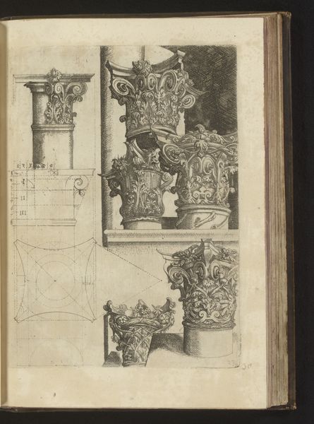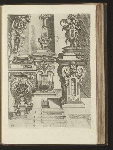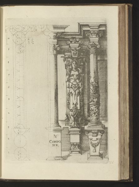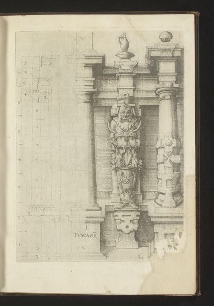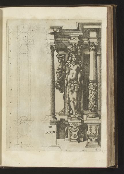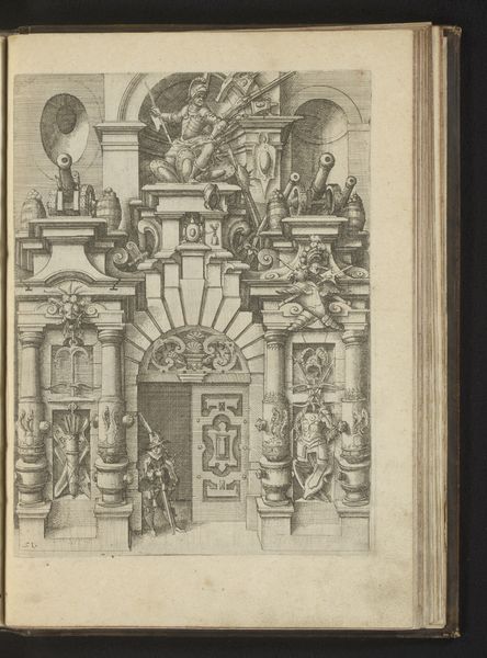 Editor: Here we have a print by Wendel Dietterlin, created somewhere between 1593 and 1595. It’s an architectural study titled “Verhoudingen van de Dorische zuilenorde met een atlant in de gedaante van een gewapende man tussen twee zuilen”— quite a mouthful! The subject is Doric columns, but there’s also this incredible figure of an armed man… a real Renaissance powerhouse. The engraving seems both precise and wildly imaginative to me, a bit like an architect’s fever dream. What leaps out at you? Curator: You know, looking at this, I feel transported to a world where architecture isn't just about shelter; it's about expressing grand ideas. That figure, holding up the structure like that! It’s as if he's bearing the weight of civilization itself! Do you see how Dietterlin blends precision with this almost theatrical flair? It makes me think he's not just showing us the design, but trying to capture a feeling. It makes me want to flex and strike a triumphant pose - although maybe I shouldn’t! Editor: Definitely feeling that triumphant pose vibe! And I see what you mean about the theatrical flair. The ornamentation almost seems to spill out of the strict Doric order. I guess it’s interesting that the armed man, a symbol of power, is literally doing the work of architecture. Curator: Absolutely! The way the weight is literally visualized speaks volumes about power, responsibility, and the very human desire to leave our mark. And consider that Dietterlin was working at a time when Europe was rediscovering classical forms - but reinterpreting them with this new Renaissance swagger. A thought: Does this give you a new appreciation for the role of art, both then and now, in not just documenting, but *shaping* cultural values? Editor: Definitely. I hadn't thought about the weight of civilization until now, but you're right; it really does come across! Curator: Glad to have inspired you - keep your mind (and imagination) open, and let art be the key that unlocks our true potential.