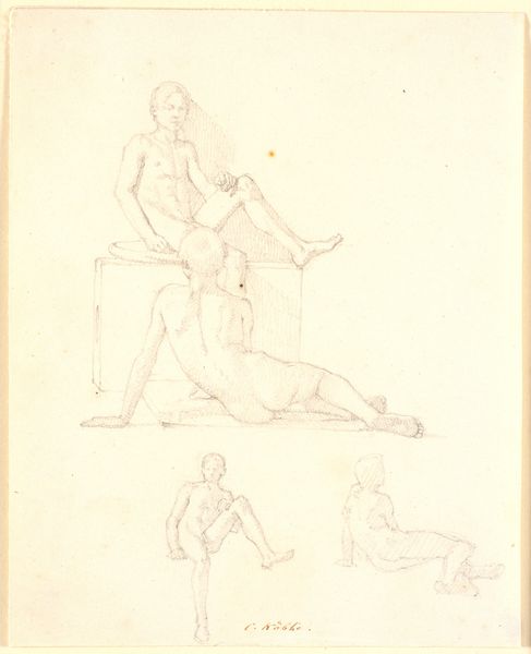 This graphite drawing on paper by John Gibson presents a collection of five statue sketches, each a study in classical form and pose. The composition, spread across the folded sheet, allows each figure to occupy its own space, yet they are unified by Gibson's delicate linework. The figures—Love, Aristides, a putto with a cat and dog, and Psyche—invite us to consider Gibson's engagement with classical ideals. The lines delineate not just the forms but also the subtle gradations of light and shadow, revealing a deep understanding of volume and texture. Gibson employs a semiotic system of classical forms and poses, each carrying its own cultural code, to engage in a discourse with the artistic traditions of the past. The drawing's power lies in its ability to destabilize our understanding of the statues. They appear as both studies and as independent works of art. This duality highlights the interplay between form and content, challenging the viewer to question fixed meanings and engage in ongoing interpretation.