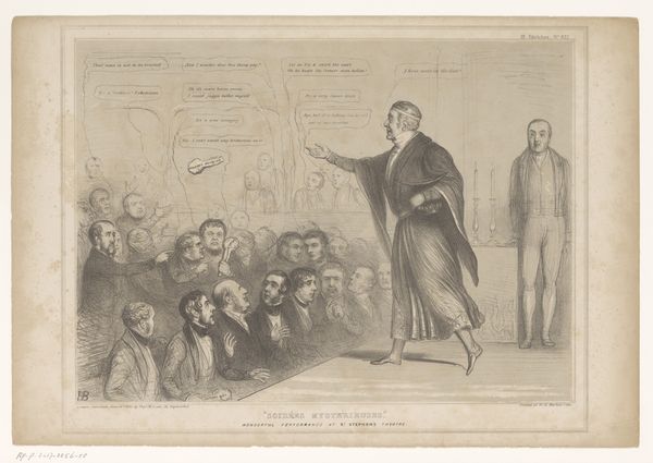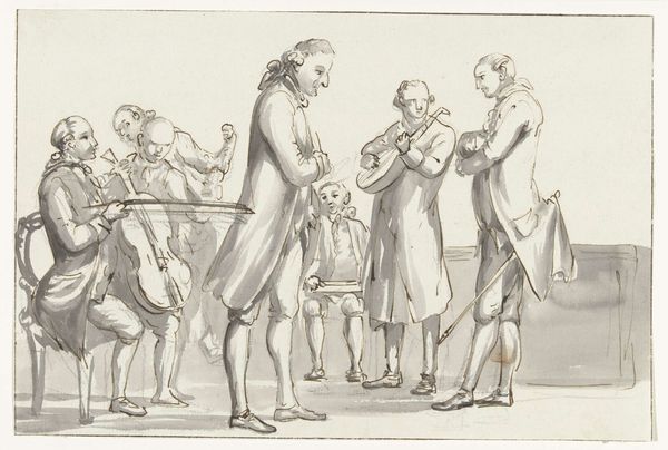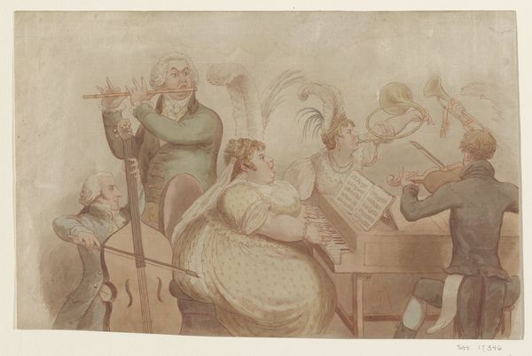 Curator: This drawing by John Doyle, created in 1838, is titled "Ancient Concerts – A Rehearsal," and it resides here at the Met. What are your immediate impressions? Editor: It's predominantly grayscale, almost ghostly, but the scene is lively, populated by many figures arranged around instruments and music stands. It gives a sense of movement even in its static form, perhaps suggestive of sound? Curator: It does convey a specific mood and narrative. Doyle was deeply engaged in social commentary, often using his art to critique the politics and social customs of his time. "Ancient Concerts" reflects on the formal gatherings of musicians. Who were these players? How did gender and class shape such an assembly? These spaces dictated societal expectations. Editor: I'm particularly struck by the arrangement of these figures in the pictorial space, the repetition of shapes – the curve of the instruments, the tilt of their heads toward the conductor. It is a unified yet informal grouping of similar figures who draw my eye toward the sheet music displayed on stands around the ensemble. What’s also striking is that a good number of the musicians are backgrounded in the scene almost in sketch-like fashion. Curator: Exactly! The ghostly rendering reinforces the idea of rigid societal expectations. These concerts weren’t simply about music, but about social performance and hierarchies. Who was included, who was excluded and whose labour goes unrecognized? What sort of coded language was embedded in such gatherings? Editor: The artist's medium – a print made from pencil and watercolor – softens what might otherwise be a stark portrayal. The tonal values almost vibrate which certainly reinforces my first impression of motion, or even controlled chaos as one might observe during the run-through of a challenging movement. Curator: Thinking about it now, Doyle's artwork isn't merely documenting a scene, it is prompting us to question and unpack the intricate social, cultural, and even political undercurrents of musical expression within a particular historical framework. Editor: For me, looking closely reveals the power of simple form – lines, shapes, tone—in the hands of a skillful artist who draws together complex social dynamics with structural composition to elicit feeling and understanding.