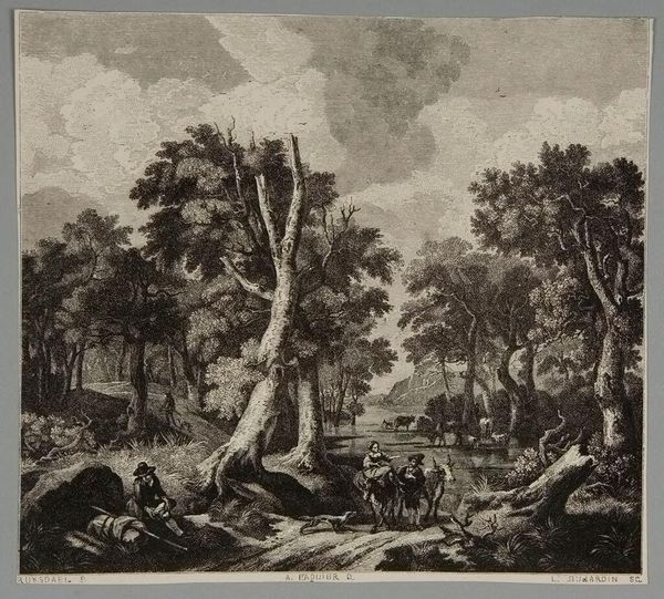 Curator: This is Pierre Charles Canot’s “Plundering the Country Peasants,” an engraving offering a glimpse into 18th-century rural life. Editor: There's a frantic energy in this print; the stark contrast pulls you into the chaos of the scene. Curator: The piece obviously speaks to the power dynamics of the time. It highlights the vulnerability of the peasantry in the face of authority, capturing a moment of exploitation. Editor: I’m interested in Canot's choice of engraving; it’s a process that allows for mass production, potentially circulating this critical view to a wider audience. Also note the materiality of the paper itself – its texture and fibers contributing to its impact. Curator: Exactly. It underscores how art can function as a form of social commentary. It invites us to think about the narratives that are being circulated and consumed and their political consequences. Editor: This print prompts reflections on the act of making visible histories of oppression and material conditions of the time. Curator: Indeed, it provides a vital lens through which to examine societal power structures.