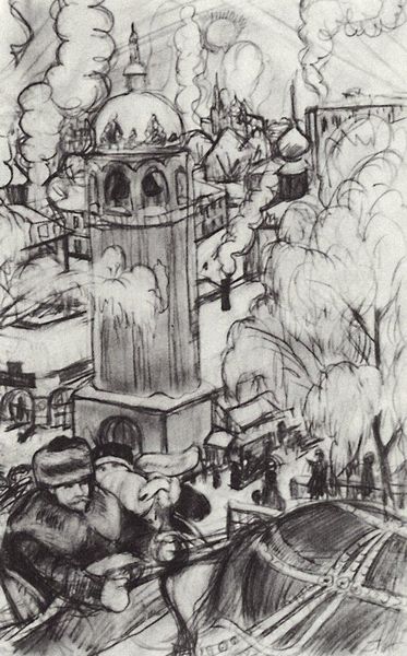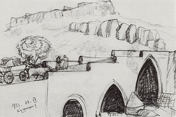 Curator: This ink drawing, "Ashtarak," comes to us from the hand of Martiros Sarian in 1934. It captures the town nestled against a backdrop of majestic mountains. Editor: Stark, isn’t it? The limited palette intensifies the composition’s contrasting lines, almost like an engraving. One observes the architectural rendering and mountainous silhouettes with near geometric efficiency. Curator: Yes, and consider how the artist plays with depth and texture. See the layering effect that separates planes? Each element, from the foliage to the distant peaks, interacts as positive and negative space with bold black strokes defining material and structure. Editor: And it's the *labor* I find intriguing—what did ink access and use look like? Was this work created on site? It looks swiftly executed, so the paper’s stability and the ink’s archival quality would have been essential, pointing toward assumptions around posterity. It is an exercise in value. Curator: You're drawn to the tangible realities, aren't you? For me, this image almost presents itself as a transcription of cultural memory. Notice the church spire mirroring the mountain peaks. Consider Sarian was also involved in stage design... there is the same heightened artificiality here. Editor: Well, context *is* everything! Thinking of craft practices, each chosen material offers us insight into Soviet non-conformist movements. Materials were not just aesthetic, but could represent economic considerations. This medium allowed the artist a portability well suited to these landscapes. Curator: You highlight its material conditions and potential functions—which is astute. However, I believe Sarian harnesses line to elevate quotidian motifs like these into the symbolic register. It transforms reality to generate deeper formal interplay between surface, space, and the abstract values embedded in the image’s design. Editor: So you find his choices primarily aesthetic, while I find them incredibly material. In the end, considering these choices sheds light on the artist’s method and even intent. Curator: True enough! Different tools grant different viewpoints, even about the same artistic moment.