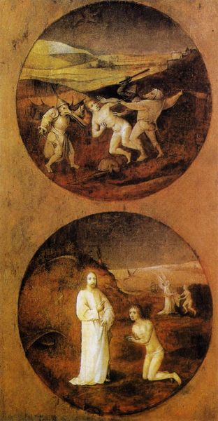 Editor: Here we have Hieronymus Bosch's "Hell," an oil on panel from 1504. It’s undeniably unsettling! The color palette is dominated by dark browns and blacks, making the sporadic fiery highlights all the more impactful. What catches your eye when you look at this piece? Curator: The compositional structure is quite striking. The eye is drawn upwards through a series of jagged forms. The stark contrast between the darkness in the lower registers and the flickers of light above create a palpable sense of unease. Note the artist's sophisticated handling of texture, particularly in the rendering of the rock formations. How does the application of paint contribute to the overall impact of the piece, in your view? Editor: I notice how thin and almost translucent the paint appears in certain areas, especially around the flames. This contrasts sharply with the thicker, more opaque application in the foreground figures, adding to the sense of depth. Curator: Precisely. And consider the overall form of the painting – its vertical orientation. How does this choice of format affect our interpretation of the subject matter? Editor: It emphasizes the descent, doesn't it? The eye falls downward, mirroring the theme of damnation and the plunge into hell. Curator: A keen observation. The artist manipulates form and color to reinforce the underlying concept. What have you gleaned from this analysis? Editor: I see how Bosch used darkness and light, thick and thin textures, to draw me in but keep me off balance, and how even the dimensions contribute to this disturbing effect. Thank you. Curator: Indeed, a focused analysis reveals the artistry beneath the grotesque.