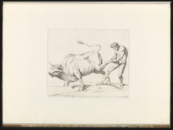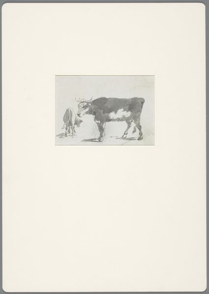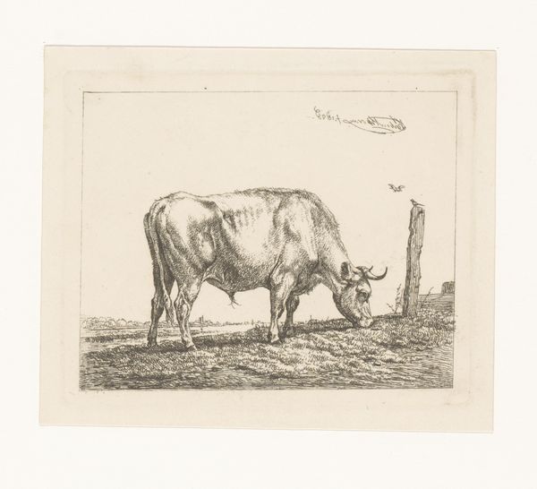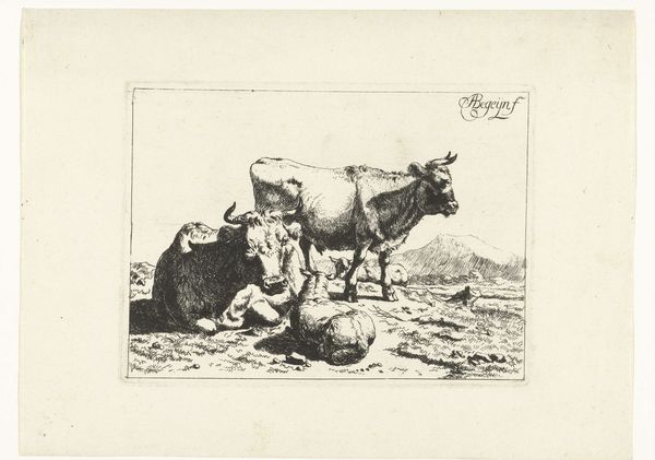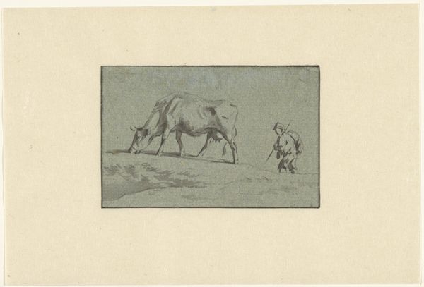 Curator: Welcome. Today we are looking at "Landscape with Grazing Cows," a pencil drawing made between 1792 and 1810, created by Wouter Johannes van Troostwijk, which is now held at the Rijksmuseum. Editor: Immediately, the image whispers pastoral tranquility. There's a certain unassuming honesty in the depiction, almost stark in its simplicity. The grazing cows evoke images of domestic harmony. Curator: It is interesting to consider that Troostwijk was dedicated to depicting the landscape of the Netherlands in a truthful way, reflecting a specific area. Note the structure achieved by simple line work, rendering depth in the fields. The atmospheric perspective, too, indicates a subtle gradation. Editor: These cows have an iconic presence. Cattle have been symbols of prosperity and peace across numerous cultures. Do you feel their placement invokes a sense of traditional values or a return to nature, something perhaps heightened in those years following the French Revolution? Curator: It seems that such iconography isn't the main subject in this drawing. I think Troostwijk attempts to capture a simple visual motif. The artistic method, including pencil strokes and composition, is, for me, the ultimate concept. The drawing focuses on lines, light, and shade and that is, essentially, the central theme. Editor: But consider how the very act of depicting them lends the animals significance, placing them not just as part of the landscape, but as figures to contemplate. Perhaps Troostwijk saw in them an inherent worth that society could easily overlook? The humble cow can thus signify something far grander! Curator: Perhaps we could both be right? There are indeed numerous levels. Editor: Precisely. This piece certainly stimulates and rewards deep thinking and analysis. Curator: And is an essential pencil work, regardless of meaning or symbology! Editor: An important reminder of art's impact.