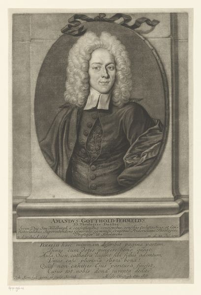 Curator: Before us, we have "Portret van Heinrich Hildebrand," an engraving dating back to 1710, currently housed at the Rijksmuseum. It's the work of Christoph Weigel. Editor: My immediate impression is the almost overwhelming detail – look at the textures, especially in the wig. It’s an explosion of curvilinear forms that dominates the composition. It's masterfully rendered with deep blacks and soft greys. Curator: Indeed, the dramatic chiaroscuro enhances the overall baroque sensibility. The print depicts Heinrich Hildebrand, a prominent legal figure and Rector of Altdorf University. Engravings like this were important for disseminating images of important people and promoting their status. Editor: Absolutely, and observe how Weigel utilizes line to construct both form and tone. Notice how the fine hatchings across Hildebrand's face create volume, lending a soft, almost lifelike quality. It directs your eye to his features—the weightiness of his stare is compelling. Curator: The portrait is a testament to the era's social structure. This image signals Hildebrand's influence and power through visual markers easily read by the public of the time: his elaborate wig, his formal robes, and the very fact of having a portrait made. Editor: I'm struck by the almost claustrophobic feel created by the oval frame. It tightly contains this riot of curls, further intensifying the focus on Hildebrand's expression. The design choice enhances the intimate scale of the image itself. Curator: These prints were rarely about intimate portrayal; they reinforced existing social hierarchies. Each carefully chosen detail projects an aura of authority around Hildebrand. He is presented to his world through carefully crafted visual propaganda. Editor: So true. Despite the intention, the artistry inherent in this method has preserved much that can be appreciated. I'm always moved by the ability to generate luminosity out of darkness, an achievement found readily across period engraving, and is particularly present in Weigel’s presentation of Hildebrand. Curator: And thanks to artists such as Weigel, this glimpse into the past reveals so much more than meets the eye—power, class, and influence through carefully calibrated visual cues, a lasting mirror to early eighteenth-century society. Editor: It shows that an exploration of artistry is possible even through the rigid constructs of cultural portrayal; despite the propaganda, some artists are genuinely concerned with the subtleties of art as visual and material form.