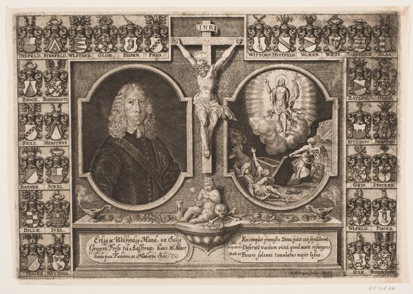 This engraved memorial print of Margrethe Lunge presents a rich tapestry of symbols. Above her portrait, putti proffer a laurel wreath beneath radiant celestial light, signifying triumph and divine favor, while female figures flank her, bearing palms of victory. The laurel wreath, a classical motif, finds its roots in ancient Greece, awarded to victors and heroes, resurfacing in Roman culture as a symbol of military success and imperial power. Similarly, the palm, once a symbol of pagan victory, was adopted by Christianity to represent the triumph of the spirit over death. Consider how these symbols, laden with historical and cultural significance, evoke a sense of timeless reverence. They tap into a collective memory, engaging viewers on a deeply subconscious level, reminding us that the human desire for recognition and immortality transcends time. The emotional power embedded in these symbols remains palpable. The cyclical progression of these motifs highlights the complex, non-linear ways symbols evolve and acquire new meanings across different eras.