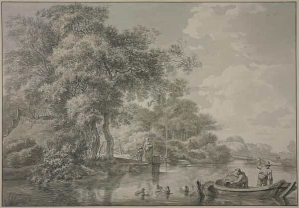 Here is a landscape drawing of the Schinkel river with a sailboat and a fisherman by Gerard van Rossum, made in the 18th century. This composition is structured by a delicate balance of light and shadow rendered in graphite. The artist uses the interplay between organic and geometric forms to create a sense of depth and space. Notice how the sweeping branches of the trees on either side frame the scene, drawing our eyes towards the quiet, rhythmic flow of the river. The light gray sky creates a soft luminosity, highlighting the textural complexity of the trees and the water. This drawing uses the formal elements to mediate between nature and culture. The fisherman and the boats illustrate the human presence and their relationship to the natural world. By using nuanced gradations in tone and texture, Rossum reflects a deep observation of nature. Ultimately, it is the formal qualities of the drawing, the linear precision, the attention to detail, and the interplay of light and shadow that invite us to contemplate the relationship between humanity, nature, and representation.
