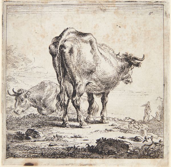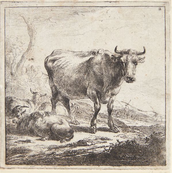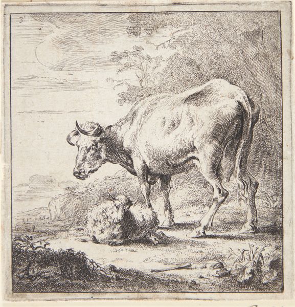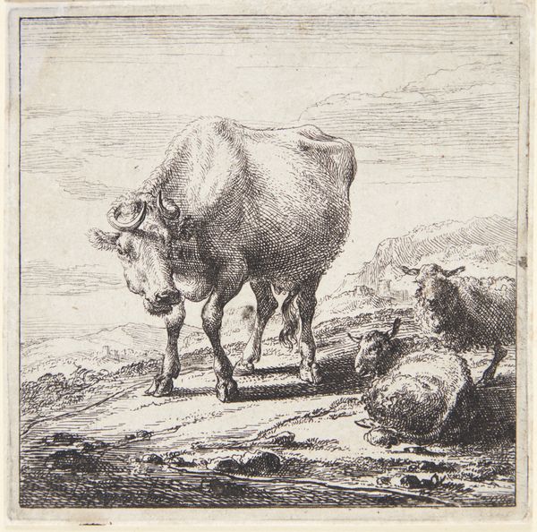 Curator: Before us is "Standing Cow and Two Lying Sheep," an etching made by Nicolaes Berchem in 1644. Editor: My first thought is how the stark, almost scientific quality of the linework makes me feel like I'm viewing specimens under observation rather than livestock in a pasture. Curator: Indeed. Let's consider the socio-economic landscape in which Berchem was working. The Dutch Golden Age was a period of tremendous economic growth fueled, in part, by agricultural production and trade. The intense interest in accurately rendering such subjects reflects the material value society placed upon livestock, doesn't it? We must note how such value also informed social dynamics back then. Editor: Absolutely. Beyond mere economic indicators, the positioning of the cow—standing tall and robust, facing the viewer, as compared to the lounging sheep behind—speaks volumes. It creates a hierarchy, drawing a stark visual and perhaps also social line, given that land ownership in the 17th century was primarily a privilege afforded to men. The passivity projected from the sheep enhances this contrast, quietly reinforcing prevailing power structures. Curator: I'm intrigued by the level of detail he achieves using only etched lines. Look at the subtle shading he manages on the cow’s hide, which surely attests to both the high caliber of materials and mastery over tools and equipment employed in the print-making process during that period. The sheer volume of livestock prints flooding the market during the 17th century further suggests that there were major networks involved, creating demand for specialization and technical refinements that Berchem surely benefited from. Editor: And this, for me, highlights how seemingly benign genre scenes become fascinating sites of meaning-making, revealing complex socio-economic and gendered power dynamics. Even a bucolic landscape, rendered with meticulous detail, echoes broader discourses shaping early modern European society. It is difficult to simply cast aside these works as being merely descriptive! Curator: So, whether it be the labor and materials involved or the socio-economic commentary subtly embedded in the subject, analyzing these types of works provide valuable insight. Editor: Definitely food for thought. They reveal far more beneath the surface when approached critically, showing that these aren’t just any idyllic farm animals at all.