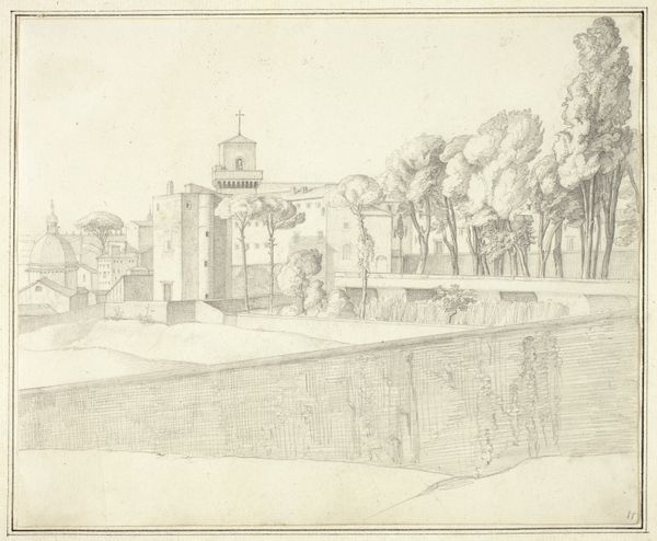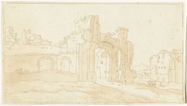 Editor: So this is “Ruins of the Great Hall of the Baths of Caracalla, Rome,” a pencil and ink drawing by Anthonie van den Bos, dating between 1778 and 1838. I’m immediately struck by how delicate it is. It feels almost like a memory fading on the page. What's your read on this? Curator: That's beautifully put. Fading memory is perfect, isn’t it? I find myself thinking about the allure of ruins – not just the romantic, picturesque aspect, but the deeper question they pose. Van den Bos is inviting us to consider the fragility of even the most seemingly permanent structures, like the Roman Empire itself. It’s less about the baths themselves, and more about *time's* bath. Does that resonate with you? Editor: It definitely does. The sketching style reinforces that impermanence – it's so light and airy. Was this typical of artists at the time when depicting Roman ruins? Curator: Absolutely. There was a whole cottage industry of artists, especially Northern European artists, who went to Italy to sketch these very scenes. It was part of a larger fascination with classical antiquity and its influence on art and architecture. This is also a particularly beautiful rendering though – he’s managed to make stone ethereal. It is kind of brilliant. Do you get a sense of human presence despite the grand desolation? Editor: Yes! Those tiny figures in the lower-left. Almost like ants crawling over a lost civilization. I wouldn’t have noticed them without you pointing that out. This piece has definitely given me a fresh appreciation for the romanticism of ruins and how artists capture their stories. Curator: Precisely! Sometimes the power of art lies not just in what’s depicted, but in how it whispers to us across centuries. Van den Bos, with his delicate touch, reminds us that even the mightiest empires eventually crumble and are reshaped by time.