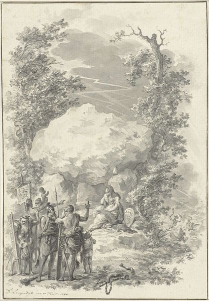 Editor: This is "Landschap met twee vrouwen bij een waterval," a landscape featuring two women near a waterfall, etched and engraved by Francesco Bartolozzi sometime between 1739 and 1780. There's something very staged about it, almost like a theatrical production set in nature. What strikes you about it? Curator: It's interesting you say that; that sense of staging connects it directly to the aristocratic culture of the 18th century. Think about the landscapes favored at the time—often idealized, romanticized views that served to reflect the power and cultivated tastes of the elite. How do you see that reflected in the imagery? Editor: Well, there's a clear separation between the 'nature' and the figures in it, even though they’re supposed to be *in* it. It doesn't feel like an organic whole. They seem very deliberately placed. Curator: Exactly. The waterfall, the carefully arranged figures, the distant scenery—all these elements are carefully composed to evoke a particular kind of experience. The inclusion of narrative, with its referencing classical themes and elevated ideals, elevates the artwork itself, doesn't it? Where do you think those aristocratic patrons were thinking of using this in their household? Editor: Perhaps in a library or drawing room, somewhere designed to inspire intellectual conversation and highlight their sophistication. Curator: Precisely. It functioned as a kind of cultural currency, broadcasting their refined sensibilities. So, it's not just a pretty picture; it's a carefully crafted statement about status and cultural values. Editor: I see! So, the art isn't just *depicting* a landscape, it’s also performing a specific social function. I had not realized that narrative and landscapes could carry political context, but I can clearly see it. Curator: Absolutely. Every artistic choice, every stylistic flourish, contributes to that performance. These are all tools for self-representation in that historical context.