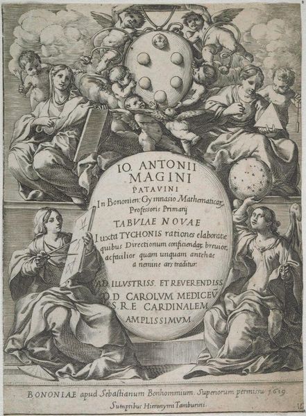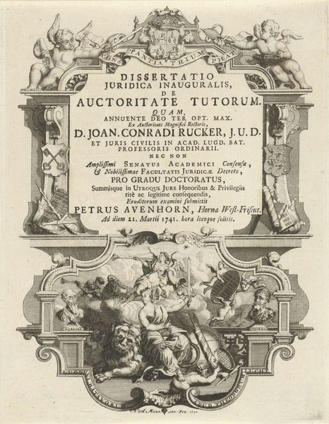 Editor: So, this etching, “Allegory on Science with Time and Fame,” created in 1729 by Reynier Blokhuysen, caught my eye. It’s incredibly detailed! The whole thing has an ornate, almost overwhelming feel, and it's hard to know where to look first. What’s your initial reading of it? Curator: Overwhelming is a good word! It’s like stepping into a fever dream dreamt by a particularly well-read librarian. Blokhuysen is drowning us in symbols, isn't he? All those cherubs tootling their horns, the laurel wreaths… It’s the visual equivalent of someone shouting their academic achievements from the rooftops. The central figures down below seem lost amidst all that clamoring for attention! Tell me, does it evoke any specific stories or eras in your mind? Editor: It makes me think of the Baroque period with all of its decorations, but, truly, I get lost looking at the details and symbolism here. I almost don’t know where to begin, though! Curator: Exactly! That was often the point, you know. Baroque loved to pile it on! Each element is carefully considered to form the ultimate statement, but taken separately the underlying message is much less obvious. Look at how Time and Fame flank Science…Are they there to guide or constrain her? It makes you wonder who holds the power, right? Perhaps it’s less an exaltation and more an exploration of the potential weight of such honor. Editor: That's a great point. It changes the tone quite a bit! I hadn't thought of it that way. Curator: Art’s funny like that, isn’t it? What appears declarative is so often just an invitation to ponder. What one sees at first glance becomes transformed by contemplation. I always like art that invites you in. Editor: I feel like I'll spend much more time looking at these works more closely. Curator: Well, then our time hasn't been wasted. I find myself itching for a visit to the Rijksmuseum already.