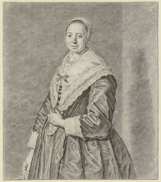 Curator: Up next is a work simply titled "Alte Frau mit schwarzer Haube und großem weißen Kragen", rendered in chalk and charcoal. The artist is Cornelis Visscher. Editor: The subdued tones give it such a somber feel. But the texture created by the chalk and charcoal, especially around the face, provides visual intrigue. Curator: Visscher, working in the Baroque style, focuses intensely on light and shadow. Notice how the stark white collar creates a strong focal point, framing the face of the woman. It almost seems to push her forward. Editor: Yes, it accentuates her features and clothing while the subtle shadows cast around the subject certainly evoke a sense of solemnity. But one can’t ignore that the portrayal of elderly women in art was often linked to concepts of wisdom or mourning during this period. Curator: It's a fascinating study in contrasts. Look at the delicate lines he uses for the face versus the almost sculptural quality he gives to the fabric through light and shadow. Editor: Indeed. Consider that this work could provide commentary on Dutch societal norms of its time. Images of women frequently reflected virtues, such as piety and diligence. Here, one can see both represented in her attire. Curator: Precisely! The seemingly straightforward composition, carefully considered lines, and stark tonal shifts underscore the formal structure that emphasizes both realistic qualities, yet maintains the symbolic weight typical of Baroque portraits. Editor: I'm drawn to think about how historical expectations of women might inform such portraits. Does her apparent modesty represent conformity? Or can it indicate more intricate details? It challenges modern viewers, and may ask one to view the socio-political implications it upholds. Curator: Reflecting upon its formal attributes and historical setting certainly unlocks numerous interpretations, allowing for an enriching aesthetic and informative experience. Editor: I am inclined to now perceive a balance. Appreciating both aesthetic details alongside an understanding of contextual considerations renders its complexities, as an exceptional portrayal by Visscher.
