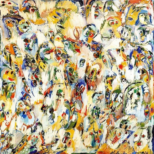 Curator: Look at this vibrant dance of colour, folks. This is "Antony and Cleopatra," painted by Gillian Ayres in 1982. You'll find it here at the Tate Modern. It's a grand splash of acrylic on canvas. Editor: Whoa, chaos! It feels like a visual earthquake happened on the canvas, scattering a whole box of gummy bears! Seriously, the first impression is loud, juicy... maybe a bit much? Curator: Well, Gillian Ayres was very much involved with Colour Field painting and Abstract Expressionism, these movements celebrate the raw energy and emotional power of color itself. The thick impasto application certainly adds to that immediacy. Editor: Immediacy, definitely. It’s almost confrontational, demanding attention. But what's with the title? "Antony and Cleopatra?" Are we supposed to see two doomed lovers in this swirl of oranges and blues? Because frankly, I mostly see breakfast cereal. Curator: The title creates an interesting tension. Ayres often referenced mythology and literature, providing a kind of key, or maybe a playful red herring. It encourages viewers to look for echoes of that tragic love story, perhaps in the intense passion suggested by the colours, or the sense of impending doom hinted by the darker shades. It’s not about direct representation. Editor: So, it's more about the emotional resonance of the story then, influencing her process... Okay, I can dig that. Thinking about Shakespeare, it DOES evoke a sort of lavish, over-the-top, doomed romance kind of feeling. I mean, imagine them drowning in a sea of acrylic paint... tragically beautiful, in a messed-up way! Curator: Precisely! Ayres’s work also fits into a post-war art historical context where pure abstraction becomes a valid subject to be observed in galleries, a shift from conventional academic themes and standards. Editor: It's wild how just throwing paint around can carry so much weight, and context, right? Knowing that helps me engage with this chaos instead of just running away from it. Still thinking about cereal, though. Curator: Art has this magic power, doesn't it, of making a seemingly random canvas into a vessel of human stories. I'm grateful to share my analysis on it. Editor: Agreed. It definitely gives you a whole lot to think about, doesn't it? The beauty is truly there and very powerful!