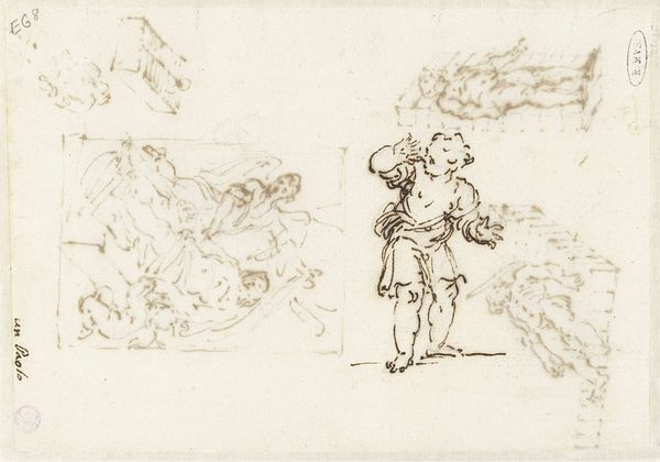 Curator: Here we have "Pastoral Scene with Two Figures," a drawing from around 1652 by Gesina ter Borch, housed here at the Rijksmuseum. Editor: My immediate impression is one of delicacy; the thin lines of reddish-brown ink give the whole composition a light and airy feel, despite the narrative scene playing out. Curator: Ter Borch was working during the Dutch Golden Age, a period of immense societal change and relative economic prosperity, but one still highly structured. It is likely that such idyllic representations are staged to offer some social commentary or at least reflect some idea about relationships, leisure and gender at the time. The two figures could tell a myriad of stories. Editor: Agreed. The drawing is full of intriguing little details. Take the figure on the left: note the line of the stick which creates a dynamic diagonal leading to the other figure and tying both landscape and its figures together. The whole work feels meticulously structured, as if its composition is crucial to the image itself. Curator: Indeed, the very act of depiction implies choice. It begs questions about societal hierarchy within families or the class dynamics structuring people’s interactions and relationships, don't you think? Editor: Yes, though consider too how she renders light. Notice the layering effect to create darker areas adding depth and shadow, while also softening lines around the figure of the woman to create a captivating central focus to the overall work. Curator: That also leads to another aspect of societal expectation. Note how the female figure in particular is positioned at the centre. Editor: Precisely. The subtle details draw us in – the curve of a branch, the slant of her hat and even those curious birds flying in the background add visual rhythm across the scene. It's a testament to the power of minimal means to create such a world in only ink and pencil. Curator: And within that world, she also invites us to consider gendered roles and expectations—which is itself something to examine when thinking about any artwork. Editor: I’ve certainly appreciated examining these relationships within her artistic choices of composition and light. Curator: It’s in considering the interplay between them, I think, where we truly find a richer appreciation of not just the art itself but the society and person who created it.