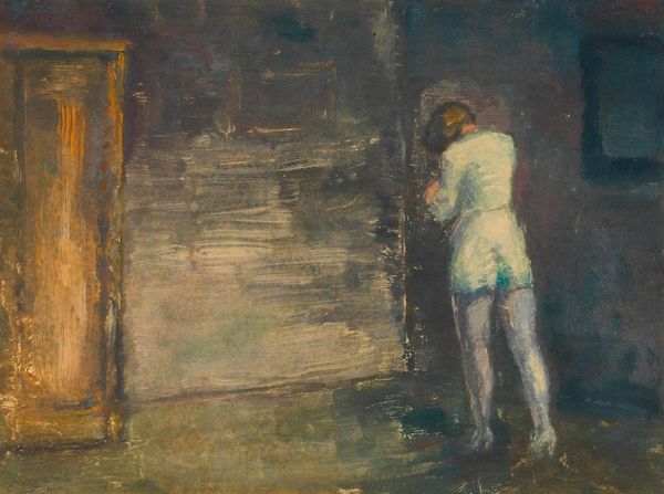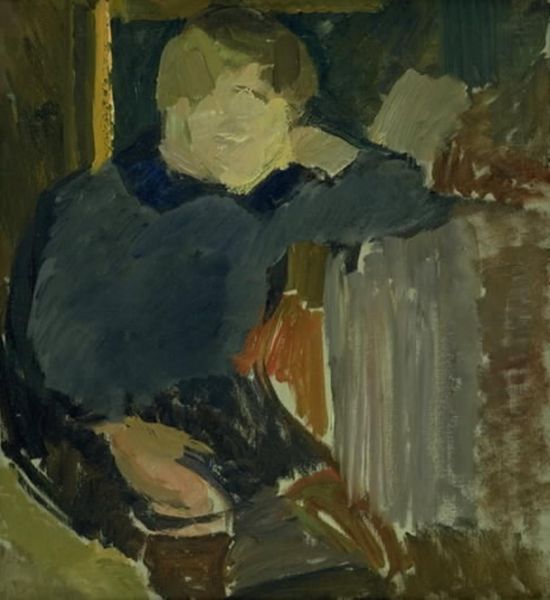 Editor: This is Édouard Vuillard’s "Seated Woman Dressed in Black," painted in 1893. It’s oil on canvas and part of a private collection. The initial impression is of muted tones and a kind of intimate quiet. The brushstrokes are really soft and blended. How do you interpret this work from a formalist point of view? Curator: Indeed, the atmospheric effect is achieved through a meticulous arrangement of color and tone. Consider the interplay between the dark mass of the figure and the lighter, almost luminous rectangle suggesting a window. Notice how the paint application, particularly the layering of browns and yellows, creates a textured surface that obscures firm outlines and definite forms. Editor: Yes, I see how the lack of defined lines almost dissolves the figure into the background. It is less about realistic depiction and more about… the sensation of a moment? Curator: Precisely. Vuillard manipulates the very materiality of paint to achieve this sensation. Observe the ambiguous spatial relationships; the woman seems both separate from and embedded within her surroundings. The composition does not seek to represent, but rather, to present a cohesive arrangement of color planes and textures. What strikes you about the use of light, or perhaps its relative absence? Editor: I noticed the way light pools around the window, drawing the eye but also making the figure appear almost shadowed and withdrawn. It’s not a naturalistic light source, but it adds to the mood, almost dreamlike. Curator: The formal elements converge to evoke a particular mood through solely pictorial means. There is an underlying structural complexity revealed through prolonged, careful examination. Editor: That's fascinating. I see how analyzing these choices offers insight without necessarily needing biographical details about Vuillard or historical context. Curator: It highlights the self-sufficiency of the visual language employed by Vuillard and demonstrates the potent expressive capacity of purely formal means.