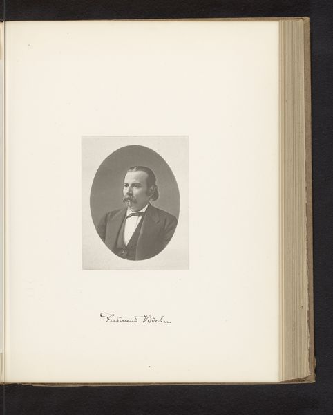 Editor: Here we have a gelatin silver print, "Portret van Johannes Takanen," dating from before 1883. It’s a photographic portrait. I'm struck by how this portrait uses an oval format—a bit old-fashioned, even then? What stands out to you? Curator: The oval format certainly speaks to an established visual language, a way of framing individuals within a canon. Think about what ovals evoke: mirrors, lockets, echoes of classical portraiture. The print is nestled in a book too; that makes it interesting. What cultural narratives are we meant to absorb along with the image of Johannes Takanen? Editor: That's a great point about the book context. So, is the placement adding another layer to how we perceive Takanen himself? Is he being elevated or memorialized in some way? Curator: Precisely! The book suggests permanence, a deliberate insertion into collective memory. Also, consider Takanen's attire, the soft tie, the hint of formality. How do those details function as signifiers? Is it trying to evoke an era of philosophers and poets? And why include his image? Editor: I hadn’t really considered it that way, but the portrait is almost operating as a kind of cultural artifact now, representing ideals beyond just the individual. Curator: Indeed. Early photography quickly assumed the cultural weight of traditional painted portraiture, inheriting all the coded messages embedded within that form. The question becomes: what is this image meant to signify for its original audience, and what does it convey to us now? Editor: Looking at it now, it's incredible how many layers of meaning can be embedded in what seems like a simple portrait. The format, the clothing, the context—they all contribute. Thanks for sharing your expertise! Curator: My pleasure. The continuous reading and rereading of visual signs are, after all, what keeps these images alive.